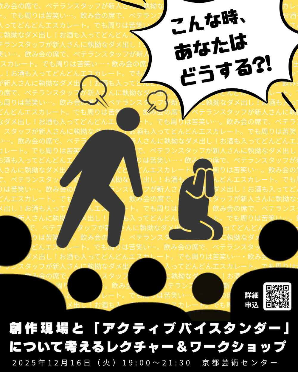今回は、講師として、舞台芸術の制作者であり、上級ハラスメント対策アドバイザーでもある植松侑子氏をお招きし、「アクティブ・バイスタンダー」とは何かを知るレクチャーに加え、舞台芸術の現場を想定したケーススタディやグループディスカッションを行います。