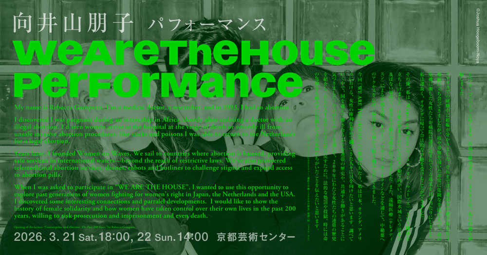 「私の身体は、私のもの」。この疑いのない言葉、あまりに自然な感覚は、法や社会制度のなかではしばしば揺らいでいる。2025 年 6月に京都でオランダのアーティスト、活動家たちと繰り広げた10日間の《WE ARE THE HOUSE》サロンでは、「中絶」「METOO」「クィア」「台所」「家父長制」「家族」など様々なキーワードとともに、身体の自己決定権について考える時間を持ちました。そこで交わされた会話、学び、気付きが 2026 年春、ピアノ、声、ビデオ、レクチャーパフォーマンス、そしてインスタレーションを用いた舞台作品となります。