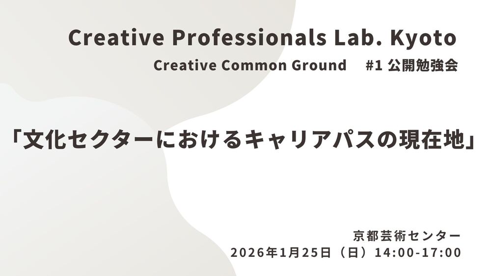 Creative Professionals Lab. Kyotoでは、さまざまな学びの場を共有する場をCreative Common Groundと名付けて開催します。第1回は、「文化セクターにおけるキャリアパス」をテーマに、文化団体や施設などで中間支援を担う実践者や担い手が、どのように経験を積み、活動を継続していけるのかについて考えます。