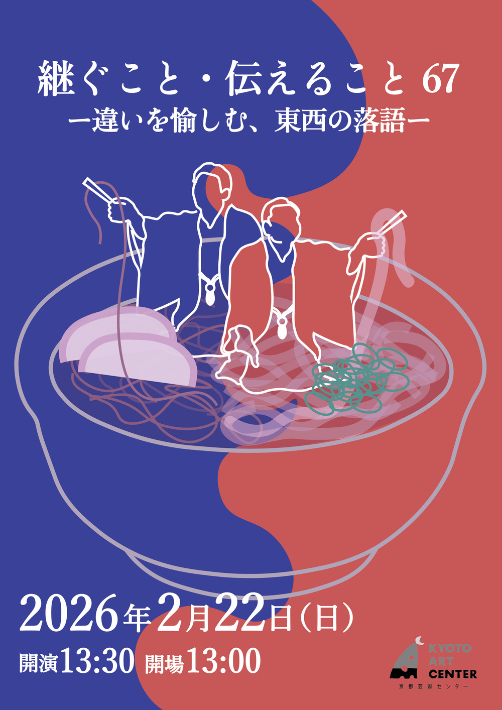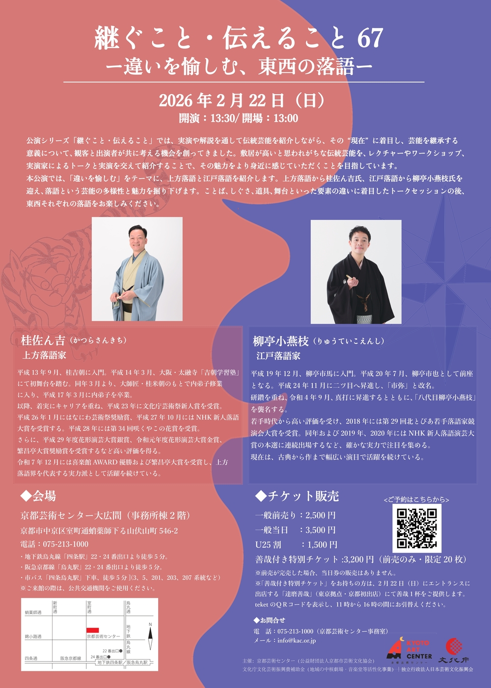 なお、本公演は、京都芸術センターで制作を行う11組のアーティストが実施する、3日間のアートイベント「Kyoto Art Center OPEN DAY 2026 Winter」の最終日に開催されます。館内で展開されるさまざまなワークショップやフード&ドリンクコーナーとあわせて、落語の世界を楽しめます。