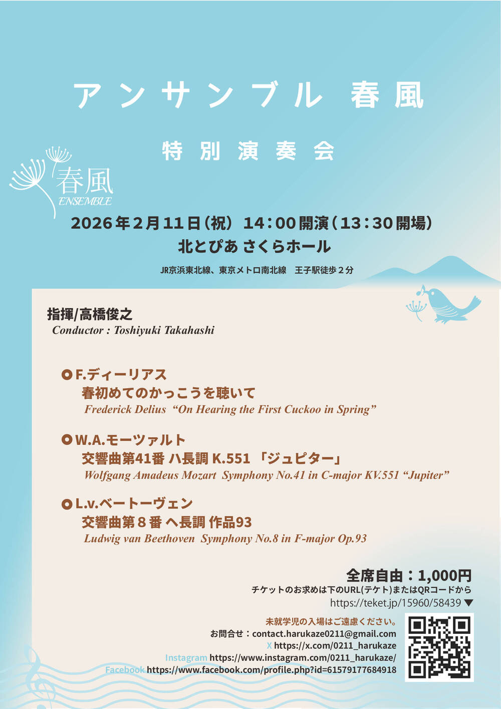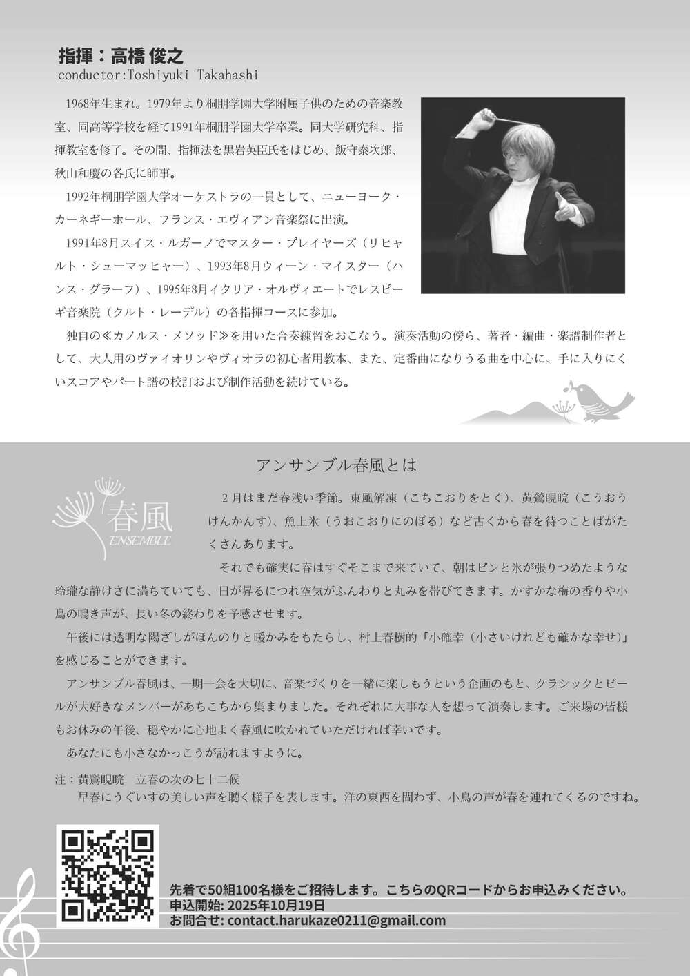 アンサンブル春風は、普段はフル編成のオーケストラで活動している有志メンバーが、「小編成ならではの響きを楽しみたい」という思いで集まって結成したアンサンブルです。 指揮は、北区民オーケストラをはじめ多くの団体を指導されている 高橋俊之 氏。