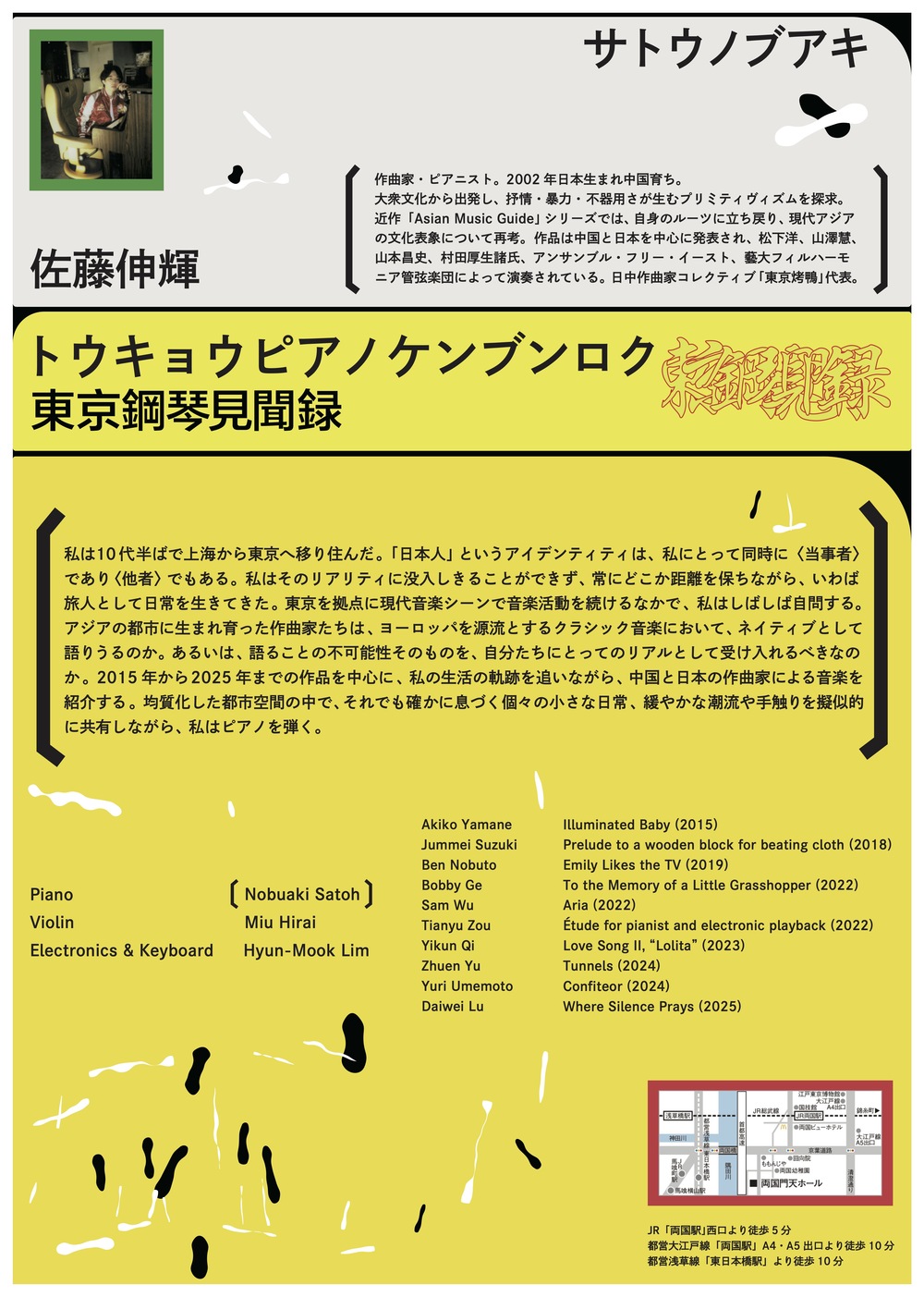 2016年から2025年までの作品を中心に、私の生活の軌跡を追いながら、中国と日本の作曲家による音楽を紹介する。均質化した都市空間の中で、それでも確かに息づく個々の小さな日常、緩やかな潮流や手触りを擬似的に共有しながら、私はピアノを弾く。