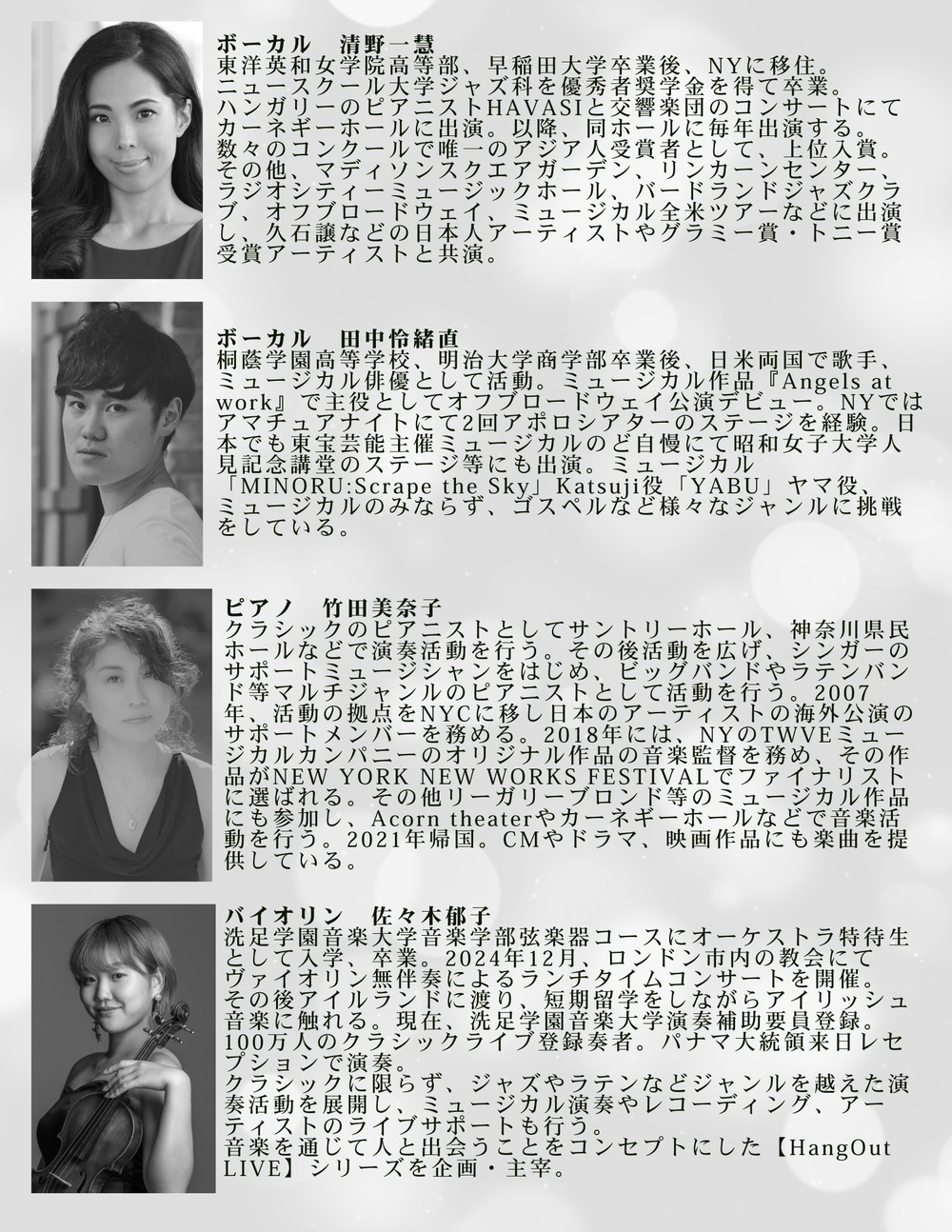その他、マディソンスクエアガーデン、リンカーンセンター、ラジオシティーミュージックホール、バードランドジャズクラブ、オフブロードウェイ、ミュージカル全米ツアーなどに出演し、久石譲などの日本人アーティストやグラミー賞・トニー賞受賞アーティストと共演。