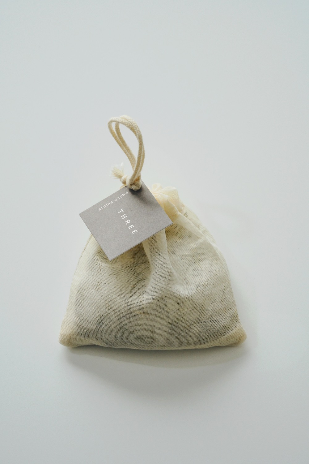 塩と精油とハーブを巾着袋に入れ、香りを楽しむアロマサシェ。今回はTHREEのAROMARIUMで提供しているベースノートに、お好みのカスタム精油を選び混ぜて、ご自身で袋に詰めてお持ち帰りいただきます。