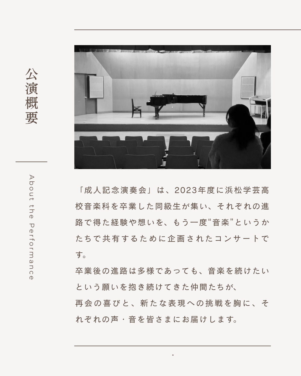 浜松学芸高校音楽科の卒業生が、大学での成長を胸に再集結!声楽・ヴァイオリン・サックス・作曲と、多彩な専攻が織りなす特別な一日。成人の記念に、感謝と音楽を届けます。