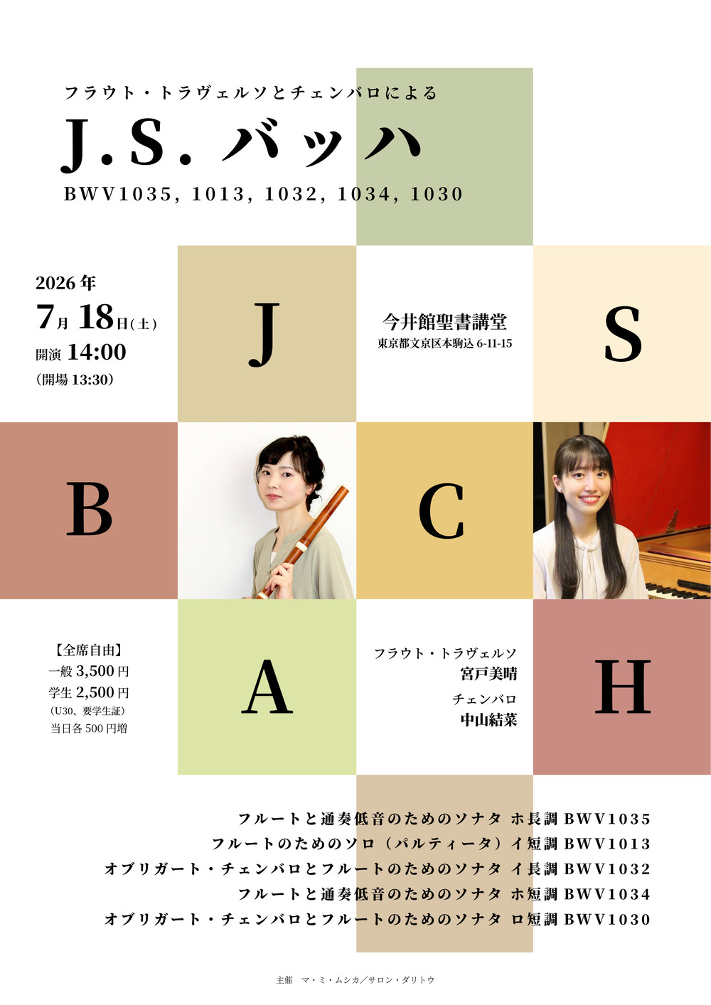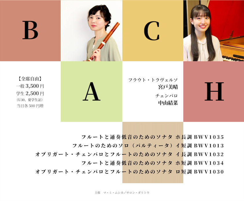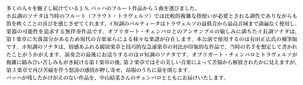 多くの人々を魅了し続けているJ. S. バッハのフルート作品から5曲を選びました。 ホ長調のソナタは当時のフルート(フラウト・トラヴェルソ)では比較的複雑な指使いが必要とされる調性でありながらも笛を吹くことの喜びを感じさせてくれます。イ短調のパルティータはトラヴェルソの最低音から最高音域まで満遍なく使用し、楽器の可能性を追求する無伴奏作品です。オブリガート・チェンバロとのアンサンブルの愉しみに満ちたイ長調ソナタは、第 1 楽章に欠落部分があるため現代の音楽家らによる様々な楽譜が存在します。本公演で使用するのは有田正広氏の補筆版です。ホ短調のソナタは、情感あふれる緩徐楽章と技巧的な急速楽章の対比が印象的な作品で、当時の名手を想定して書かれたことがうかがえます。演奏会の最後にお送りするのはロ短調のソナタです。オブリガート・チェンバロとトラヴェルソが複雑に絡み合い苦しみもがき続ける第 1 楽章の後、第 2 楽章ではその美しい音楽によって苦悩から解放されたかに見えますが、第 3 楽章で再び苦痛を伴う怒涛の感情が押し寄せ、昂揚のうちに幕を閉じます。 バッハが残したかけがえのない作品を、中山結菜さんのチェンバロとともにお届けいたします。