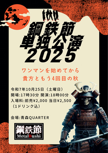 ハードロック・ヘヴィメタルと演歌を融合させた楽曲を演奏しています。 激しく楽しく、貴方を笑顔にする五人の武士。青森市を中心に活動中。 Vocal:Atc…
