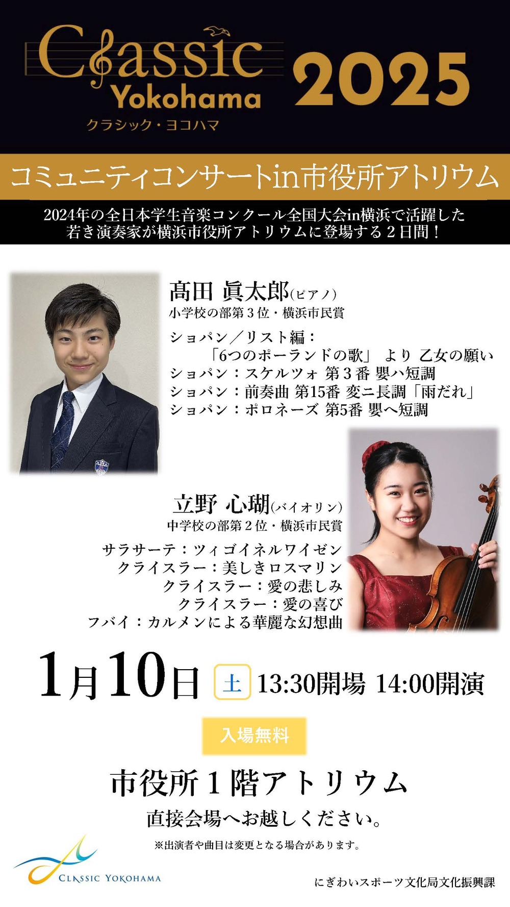 コミュニティコンサートin市役所アトリウムでは、2日間(1/10、1/11)に渡って2024年の全日本学生音楽コンクール全国大会in横浜で活躍した若き音楽家による演奏をお楽しみいただきます。