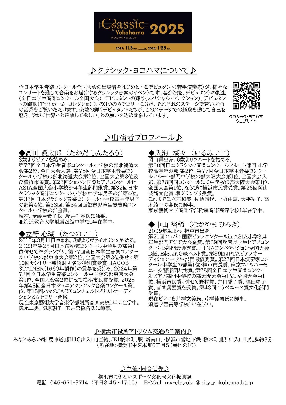 『クラシック・ヨコハマ』は全日本学生音楽コンクール全国大会の出場者をはじめとするデビュタント(若手演奏家)が、様々なコンサートを通じて音楽をお届けするクラシック音楽のイベントです。各公演を、デビュタントの誕生(全日本学生音楽コンクール全国大会)、デビュタントの輝き(スペシャル・セレクション)、デビュタントの躍動(アットホーム・コレクション)、の3つのカテゴリーに分け、それぞれのステージで若い才能の活躍をご覧いただけます。楽壇の輝くデビュタントたちが、このステージでの経験を通して自己を磨き、やがて世界へと飛躍して欲しい、との願いを込め開催しています。