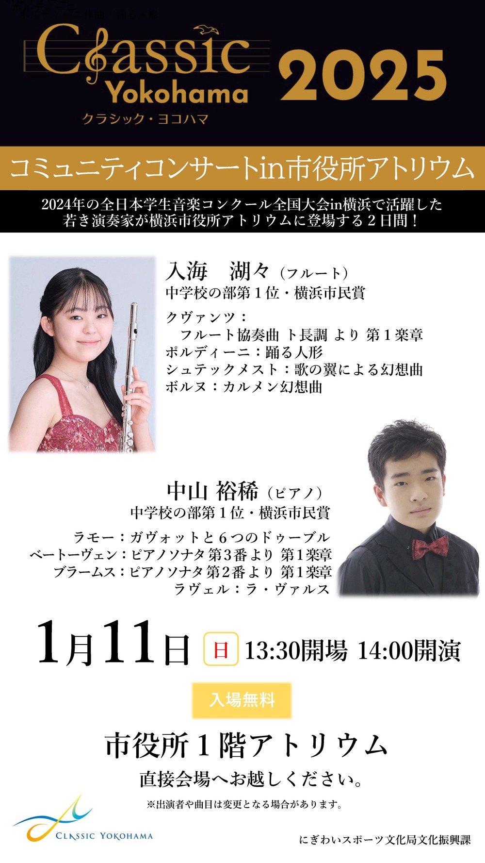 コミュニティコンサートin市役所アトリウムでは、2日間(1/10、1/11)に渡って2024年の全日本学生音楽コンクール全国大会in横浜で活躍した若き音楽家による演奏をお楽しみいただきます。