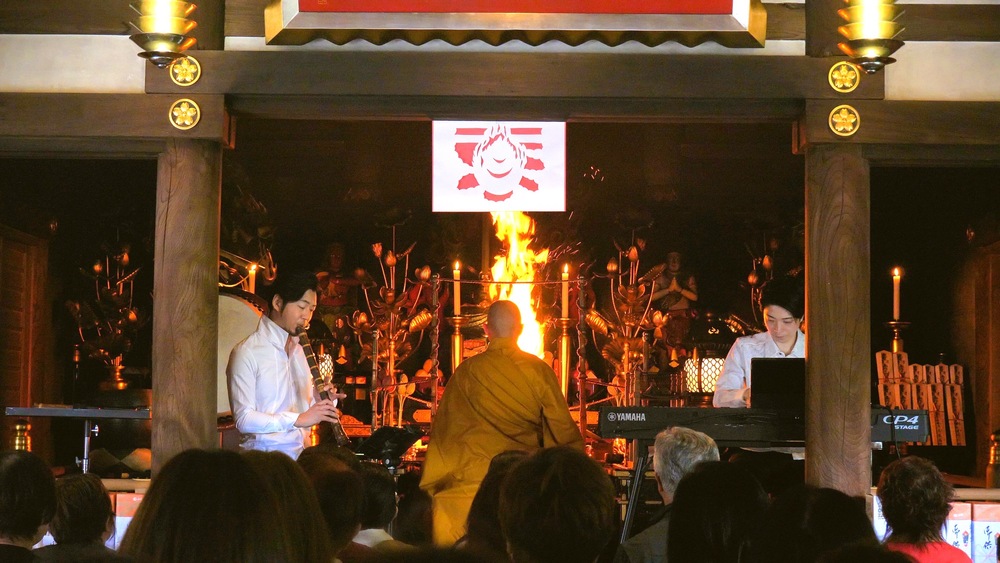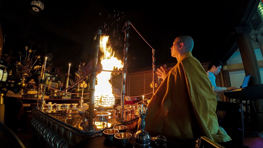 この度、須磨寺護摩堂で執り行われる奉納演奏。ほの暗い堂内を灯す護摩の炎。その中を、皆さまの願いを抱えた護摩木が焚きあげられる音、読経、リンの響き、そして流れるピアノと尺八の音色が包みます。護摩は当山副住職小池陽人が勤めます。一期一会の祈りの時間を共にすることができることを願っています。