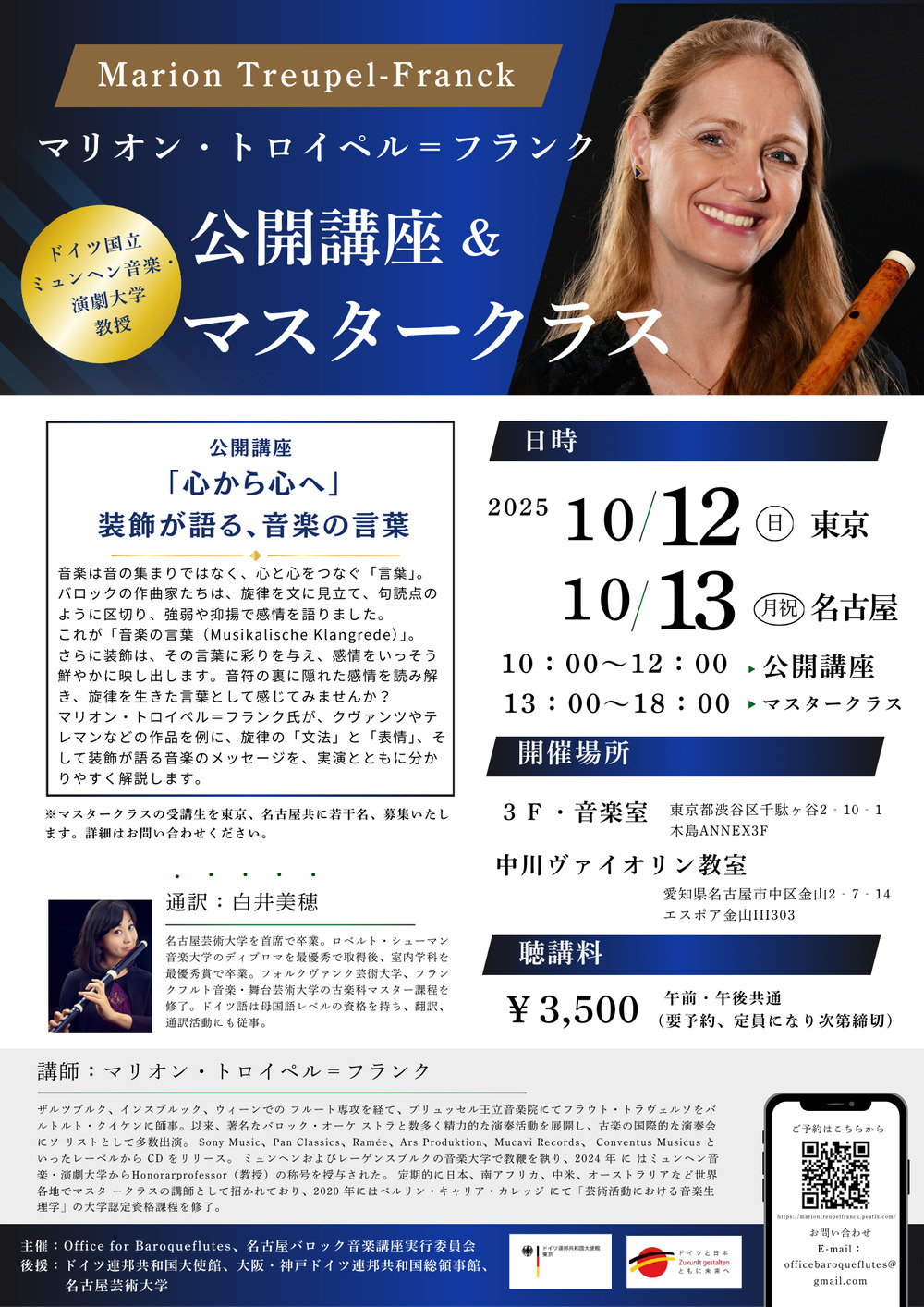 バロックの旋律を、生きた言葉として感じてみませんか?マリオン・トロイペル=フランク氏が、実演とともに解説いたします。