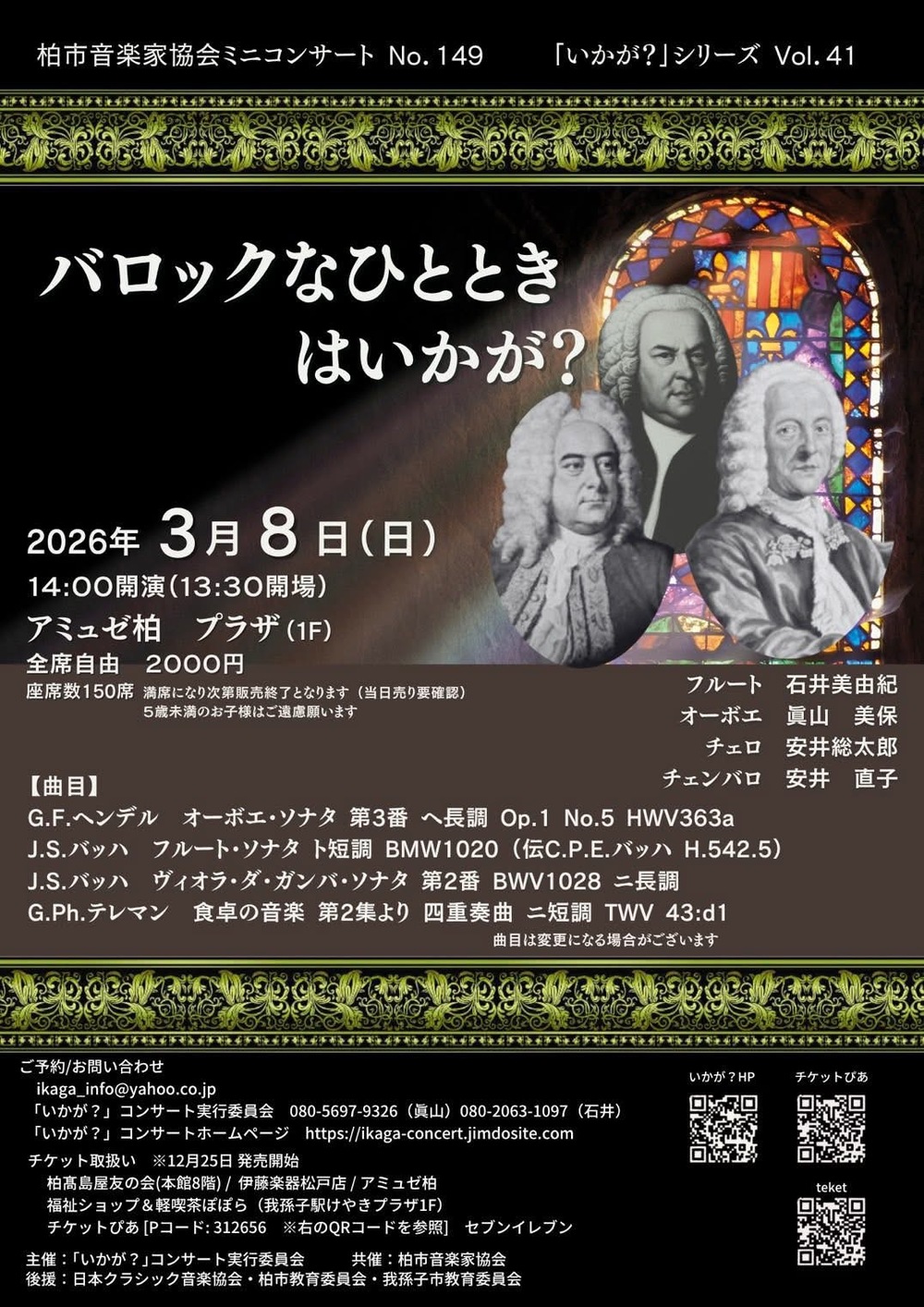 フルート:石井美由紀 オーボエ:眞山美保 チェロ:安井総太郎 チェンバロ:安井直子