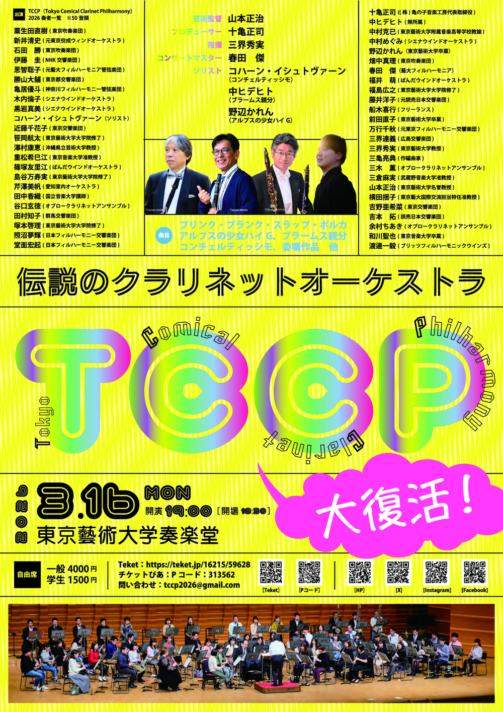 そのTCCPが、創立20周年を記念して2026年3月16日に企画した久しぶりの自主公演。会場は天下の東京藝術大学奏楽堂! クラシックの殿堂で、この日のために集まるスタープレイヤーたちが全力で難曲に挑み、音楽のみで笑っていただく。新たなる伝説誕生の瞬間に、是非お立ち合いください。