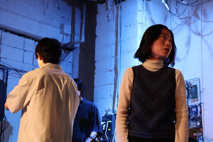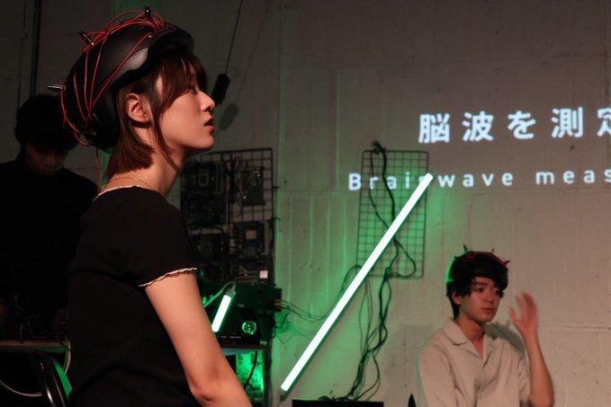 脳波測定器を介し、思考伝達とそれに伴う「言葉」と「心」の距離を観測する。