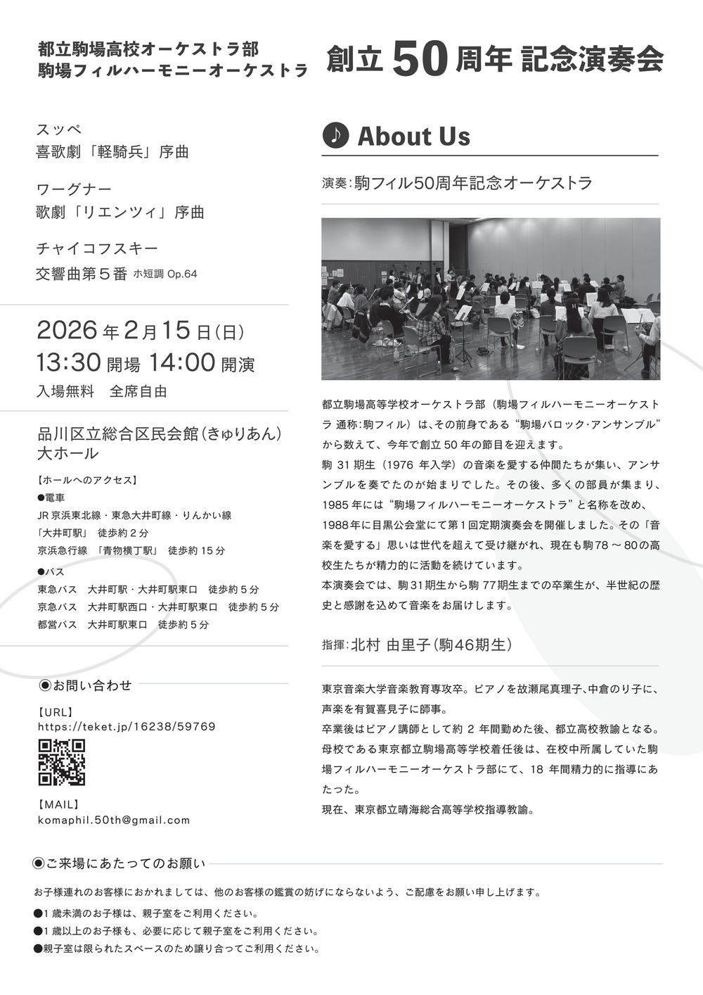 都立駒場高等学校オーケストラ部(駒場フィルハーモニーオーケストラ 通称:駒フィル)は、その前身である“駒場バロック・アンサンブル”から数えて、今年で創立50 年の節目を迎えます。 駒31 期生(1976 年入学)の音楽を愛する仲間たちが集い、アンサンブルを奏でたのが始まりでした。その後、多くの部員が集まり、1985 年には“駒場フィルハーモニーオーケストラ” と名称を改め、1988年に目黒公会堂にて第1回定期演奏会を開催しました。 その「音楽を愛する」思いは世代を超えて受け継がれ、現在も駒78 ~ 80の高校生たちが精力的に活動を続けています。
