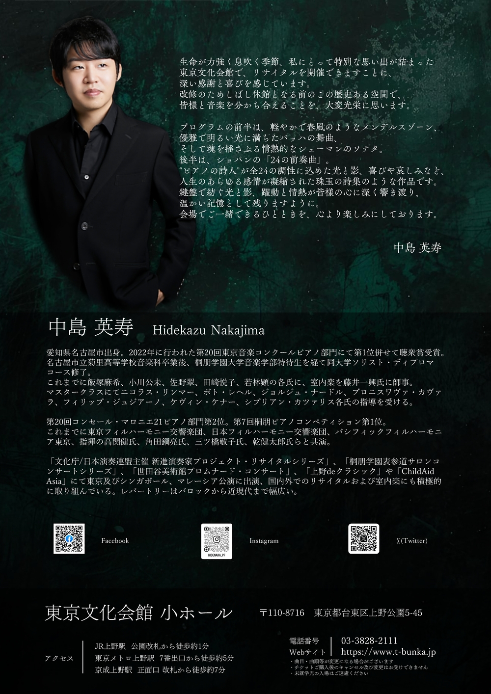 第20回東京音楽コンクール優勝&聴衆賞を受賞した中島英寿によるピアノ・リサイタル