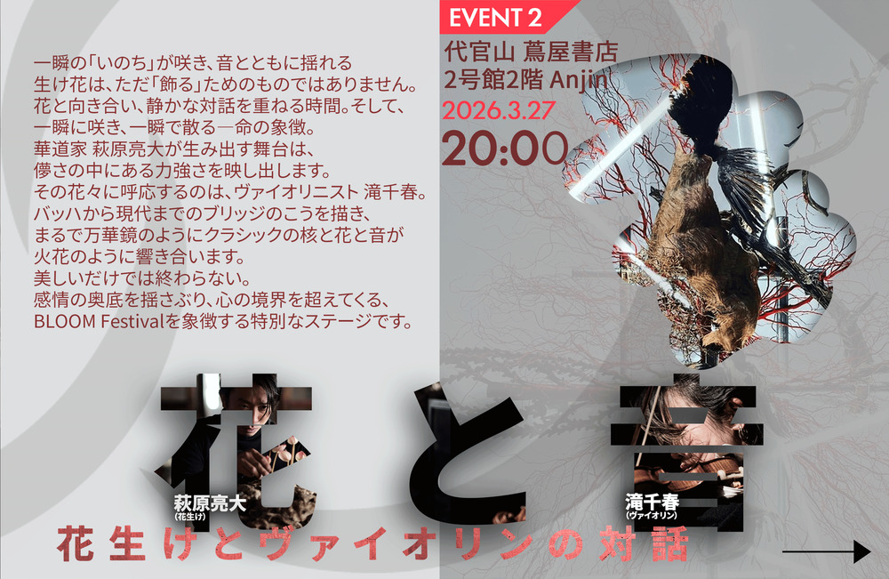 一瞬の“いのち”が咲き、万華鏡のように花と音が響き合う。華道家 萩原亮大とヴァイオリニスト 滝千春が織りなす、儚くも力強い、BLOOM Festibvalを象徴するコラボレーション。