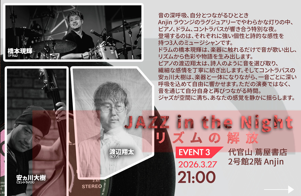 音の深呼吸、自分とつながるひととき。Anjin の柔らかな灯りの中、個性豊かな3人の奏でるジャズが心に静かに響きます。感性に寄り添う、詩的でラグジュアリーな一夜を。