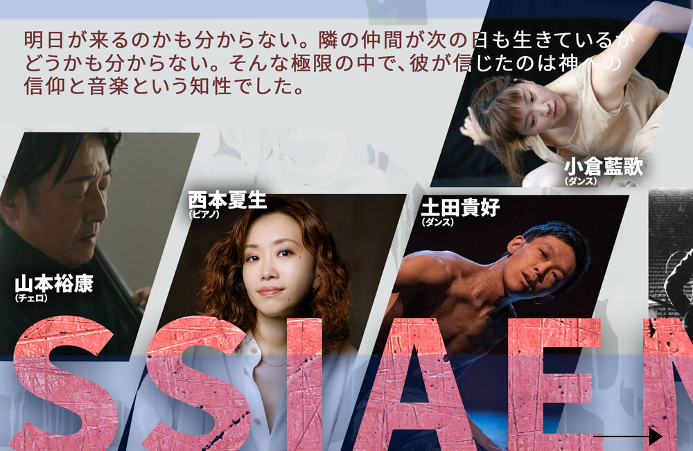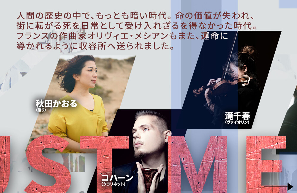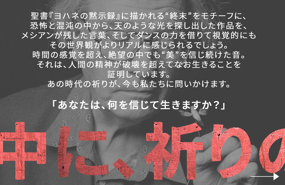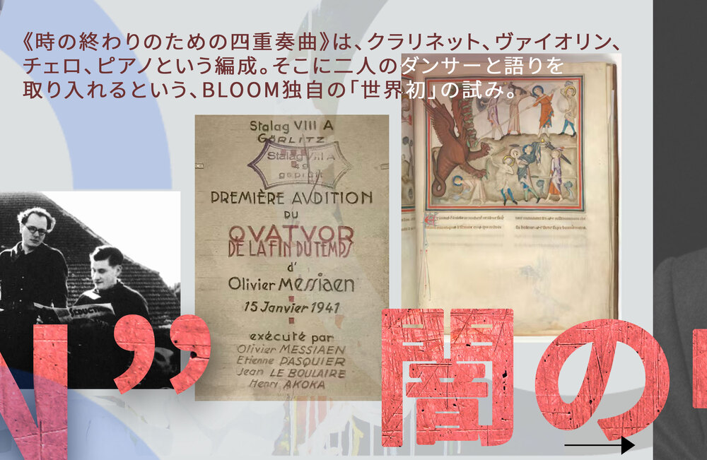 第二次大戦中、フランス兵として捕虜となり、聖書「黙示録」に導かれた収容所から生まれたメシアンの深淵の世界。収容所の楽器を集めた故に新しい楽器編成の挑戦の如く、ダンスと語りで再構成する世界初の試み。言葉で聞いて、目で見て感じるメシアンの世界へようこそ。