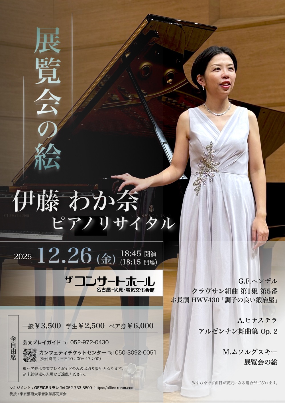 ヘンデルは“ピアノ“ではなく、“クラヴサン“の響きをどのように再現できるか・・有名な「調子のよい鍛冶屋」も、バロックならではのシンプルな変奏をお楽しみ頂きたい。そして今回のメインプログラム「展覧会の絵」! オーケストラ作品にもなったこの作品の多様性や奥深さをピアノで聴く事の出来る数少ないコンサート。