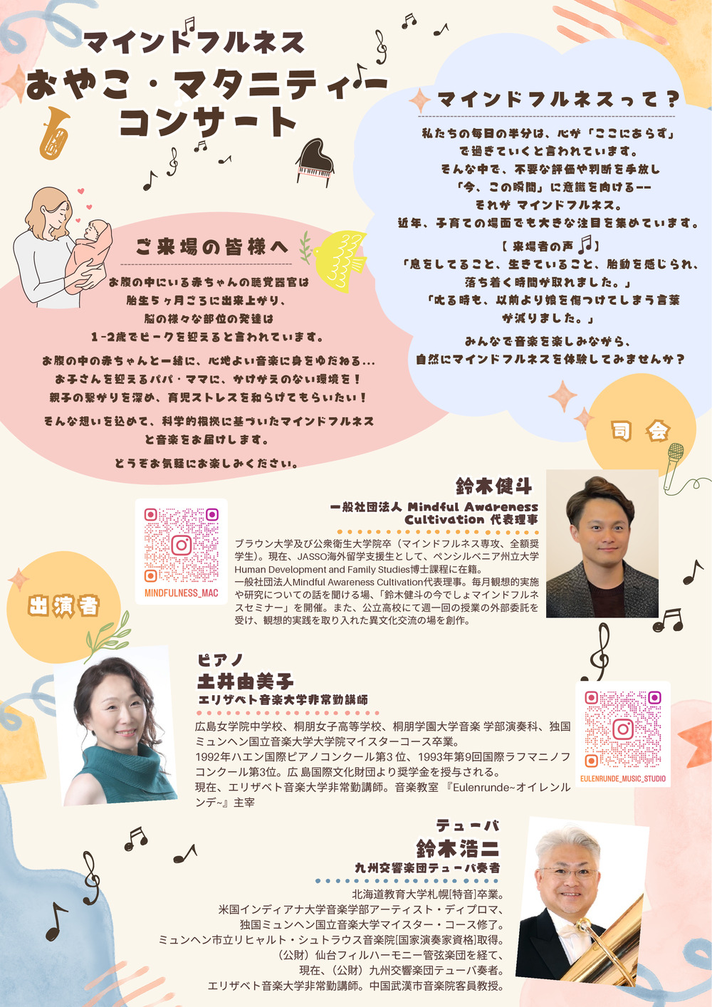リラックス効果だけでなくお子さんの豊かな脳発達にも繋がることが実証されているプロ奏者による生演奏に加えて、親子の愛着形成にも効果が実証されているマインドフルネスの要素を組み合わせることで、科学的にも裏付けされた、自然体で親子の絆を改めて感じ、味わうひと時をお届けします。