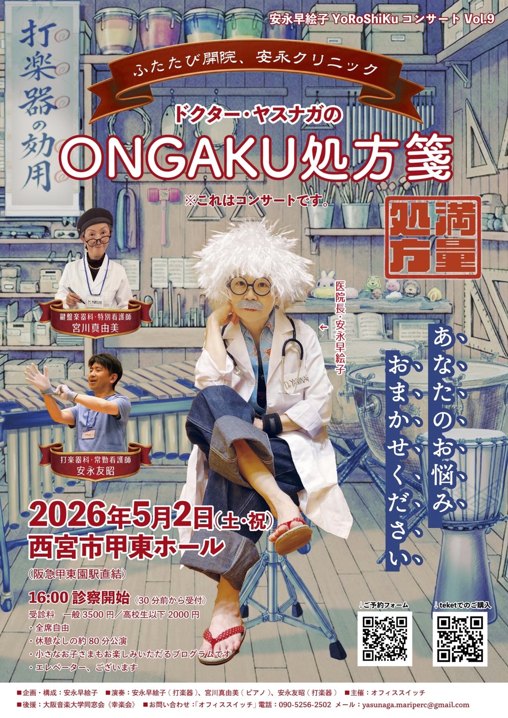 1年ぶりの今回の診察は、特別看護師として《鍵盤楽器科看護師長》の宮川真由美氏を迎えます。真由美氏の全身からあふれるエネルギーは、必ずやみなさまの明日への活力となることでしょう。もちろん、存在自体が癒し薬とも言える《打楽器科常勤看護師》安永友昭氏も健在です。
