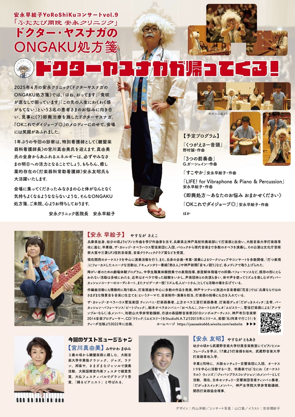 2025年4月の安永クリニック《ドクターヤスナガのONGAKU処方箋》では、「ほね、おってます」「食欲が底なしで困っています」「この先の人生にわくわく感がもてない」という3名の患者さまのお悩みに向き合い、見事に(?)即興治療を施したドクターヤスナガ。『OKこれでダイジョーブ◎』のメロディーにのせて、会場には笑顔があふれました。