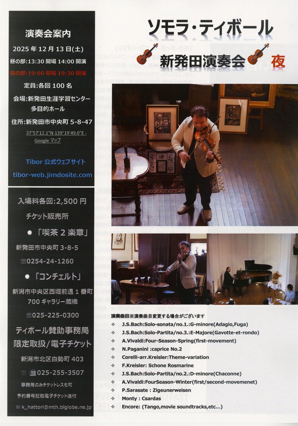 ハンガリーの至宝バイオリニスト ソモラ・ティボールの演奏活動賛助する有志 生い立ちと音楽教育 :ハンガリー・ブダペストのジプシー音楽一家に生まれ、幼い頃から音楽に親しみながら成長。ハンガリー国立リスト音楽院を卒業し、本格的な音楽教育を受ける。これにより、クラシックから伝統のジプシー音楽まで幅広い音楽性を身につける。 著名音楽家からの評価:世界的ヴァイオリニストであるジョルジ・パウク氏、アレクサンダー・マルコフ氏からは 彼のボウテクニックは素晴らしく、完璧である と称賛され、ジプシーヴァイオリニストのロビー・ラカトシュ氏、ピアニストのアンドラーシュ・シフ氏からも 才能あふれるヴァイオリニスト と高く評価されている。 【ティボール育ての親紹介】 恩師ラースロー・コーテー教授。1966年からリスト・フェレンツ音楽大学の教授を務めた。東京の武蔵野音楽大学では客員教授として7年間教鞭をとった。クラウディオ・アバドに誘われてミラノ・スカラ座のオーケストラのコンサートマスターも務めた。2005年には、ハンガリー共和国金功労十字章を授与された。