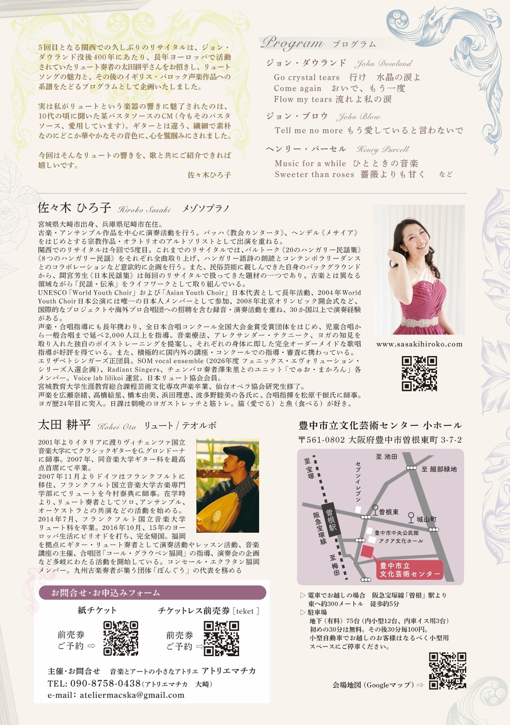 5回目となる関西での久しぶりのリサイタルは、ジョン・ダウランド没後400年にあたり、長年ヨーロッパで活動されていたリュート奏者の太田耕平さんをお招きし、リュートソングの魅力と、その後のイギリス・バロック声楽作品への系譜をたどるプログラムとして企画いたしました。