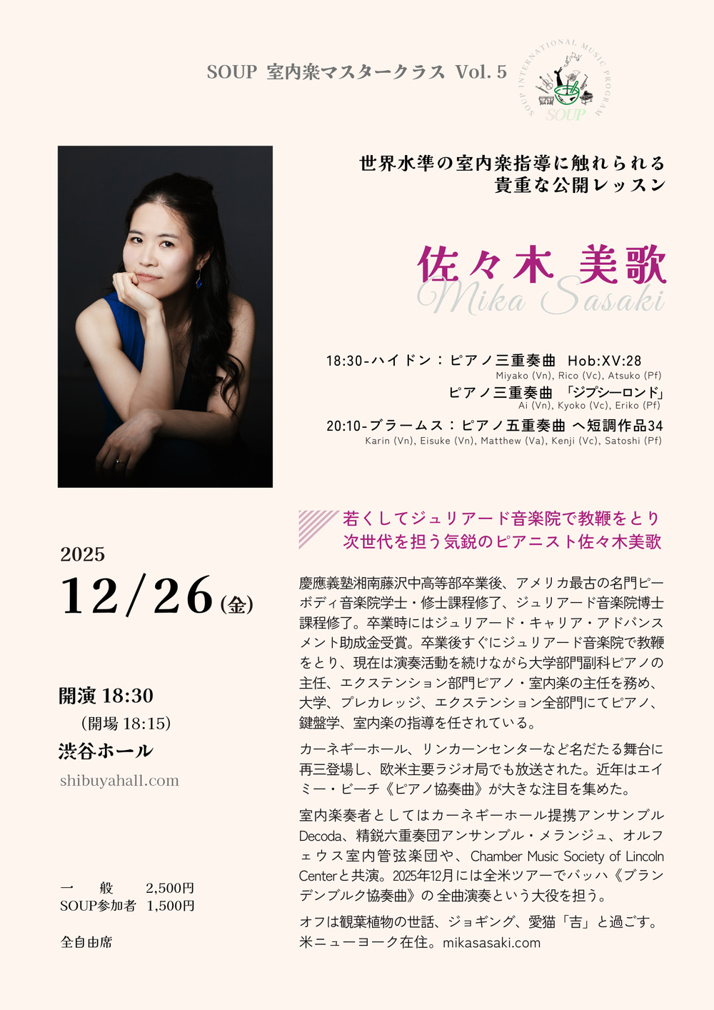 ニューヨークを拠点に活動し、ソリスト、室内楽奏者として国際的に高い評価を得るだけでなく、ジュリアード音楽院でピアノ・鍵盤学・室内楽を指導するピアニスト佐々木美歌教授。この度、来日にあわせて特別公開レッスンを行います。取り上げるのはブラームス《ピアノ五重奏曲 作品34 第1楽章》、ハイドン《ピアノ三重奏曲 Hob. XV:28 第2楽章》、そして《ピアノ三重奏曲 Hob. XV:25「ジプシー・ロンド」第1楽章》という室内楽の魅力が凝縮された名作。佐々木教授はSOUP室内楽プログラムの主要講師でもあり、2025年秋学期の参加者たちがこれまで重ねてきた練習の成果をもとに演奏します。プロからアマチュアまでの幅広い奏者による多彩な学びを聴講することは、室内楽を深めたい方にも、これから始めたい方にも新たな発見と感動をもたらすでしょう。
