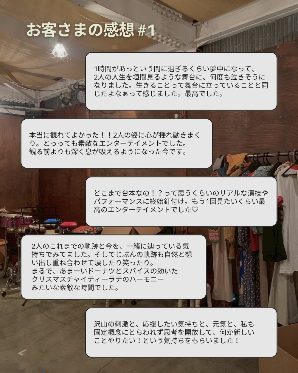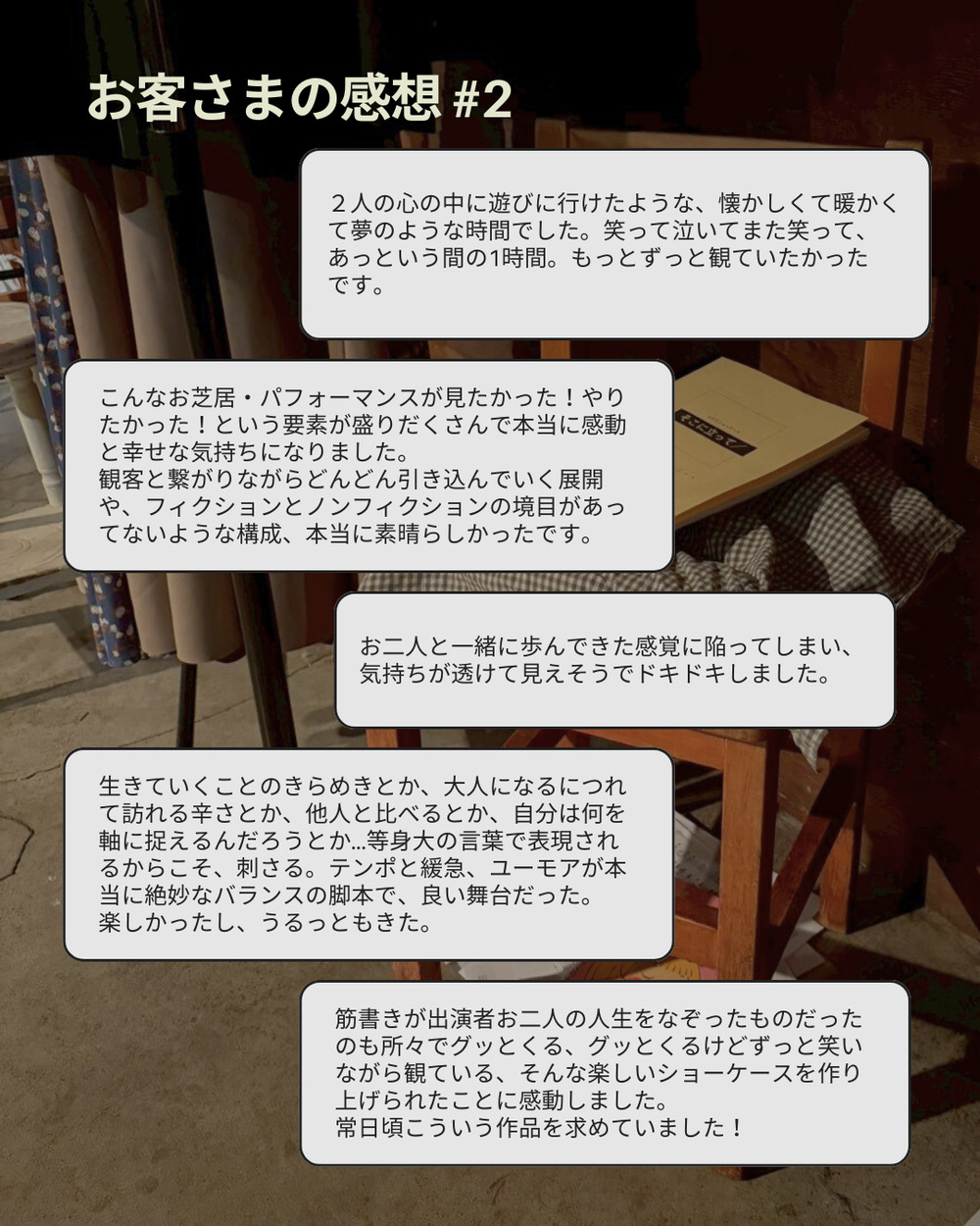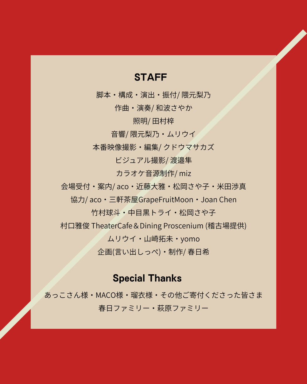 協力/ aco・三軒茶屋GrapeFruitMoon・Joan Chen・竹村球斗・中目黒トライ・松岡さや子・村口雅俊 TheaterCafe&Dining Proscenium (稽古場提供)・ムリウイ・山崎拓未・yomo