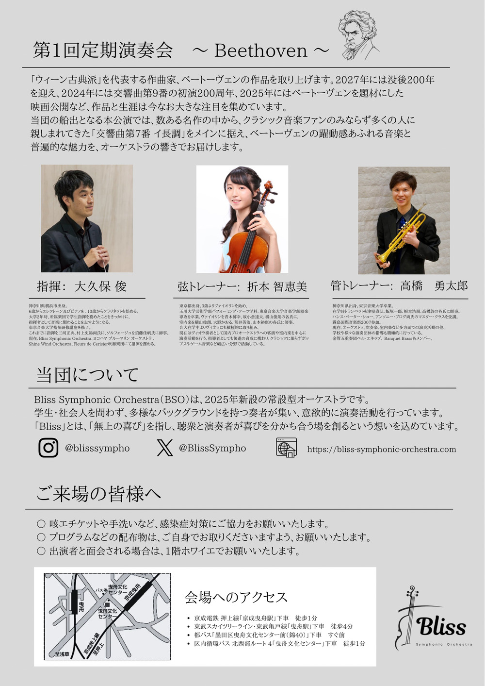 Bliss Symphonic Orchestra(ブリス シンフォニック オーケストラ、通称「BSO」)は、「奏者・聞き手が古典~近代音楽、ポップスも含めた様…