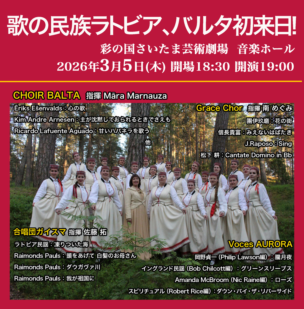 ラトビア大学の女声合唱団 “Balta”(バルタ)と日本の合唱団によるジョイントコンサートです。コンサートはそれぞれ自国の音楽作品を含めたプログラムを披露する単独ステージと、お互いの音楽作品を一緒に歌う合同ステージで構成します。