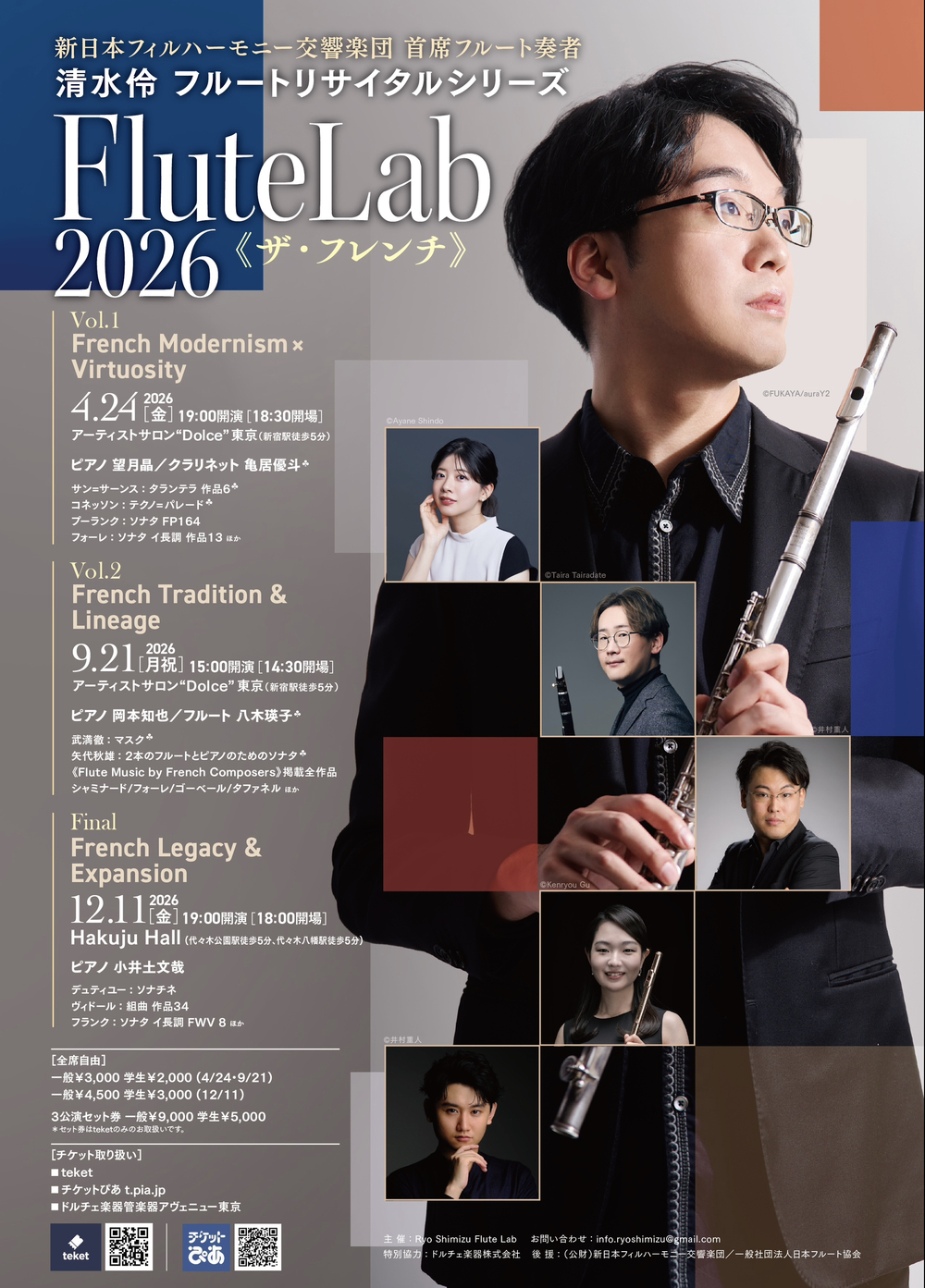 Flute Lab 2026《ザ・フレンチ》Vol.2では、フルート伴奏のスペシャリスト・岡本知也、そして盟友であり若手フルート界をともに牽引する八木瑛子を迎える。