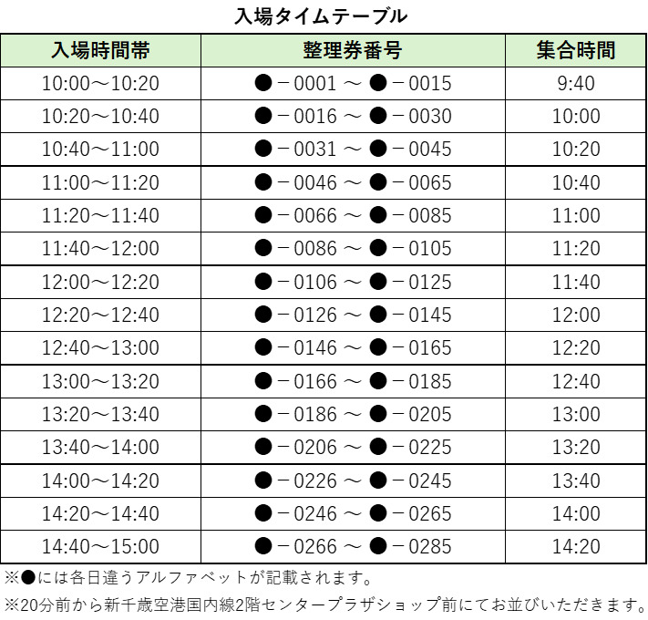 ・整理番号ごとに入場時間および集合時間が指定されております。
