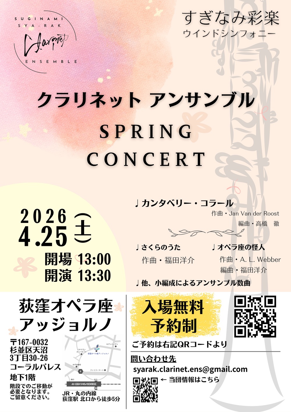 すぎなみ彩楽ウインドシンフォニーのクラリネットパートによるアンサンブルコンサートを行います。