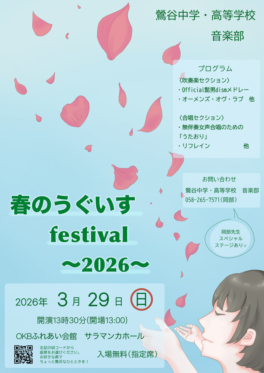 岡部先生スペシャルステージあり!今年も東京藝術大学音楽環境創造学科2年に在学中で鶯谷の卒業生でもある 大村周稔 作詞&作曲の連作歌曲を披露!(予定)