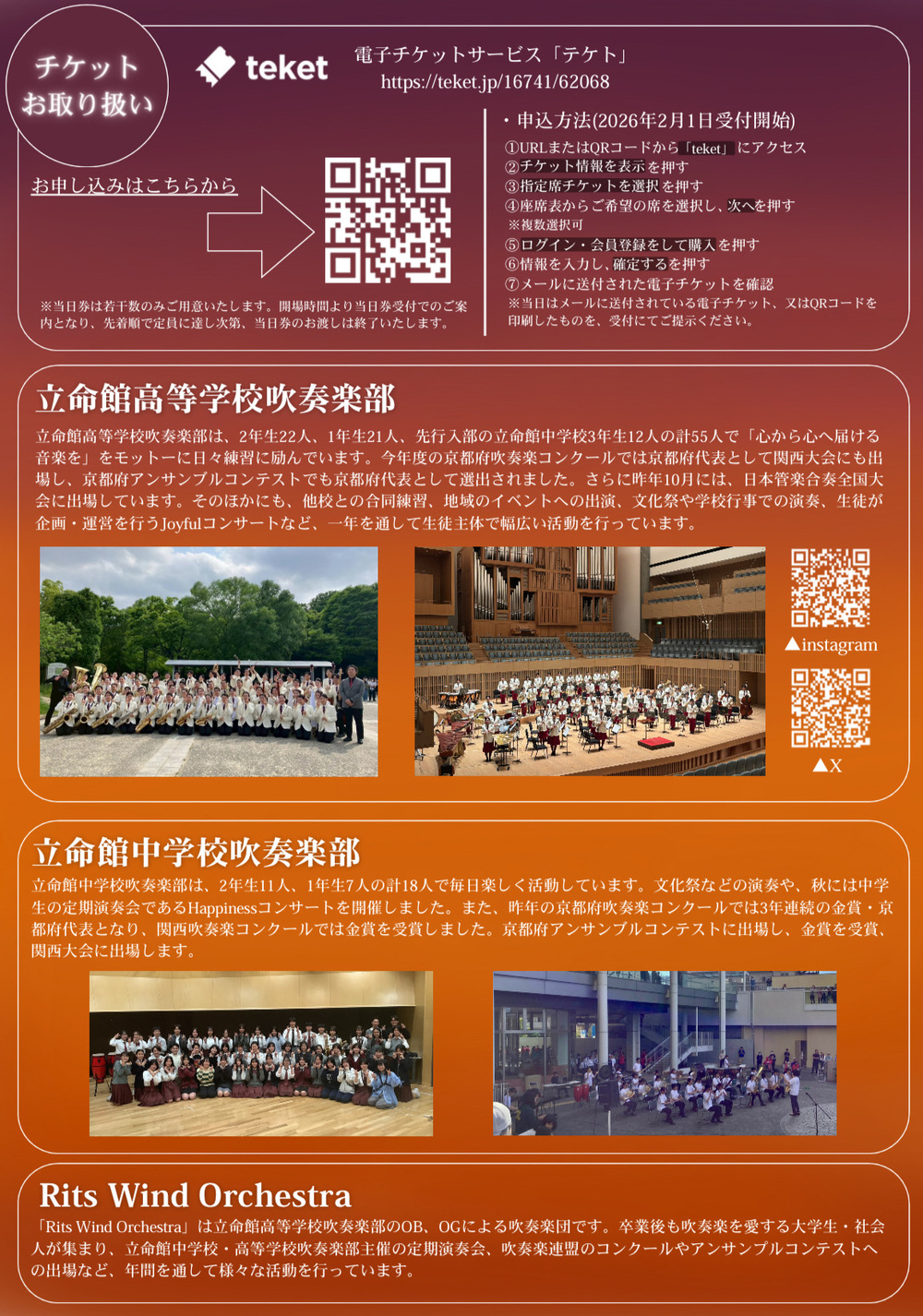 その他のお問い合わせ先:ご予約されたお席をキャンセルされる場合は、上記のメールアドレス(ritsumei.band.teien@gmail.com)から、お名前、座席番号、注文番号を明記の上、お知らせください。
