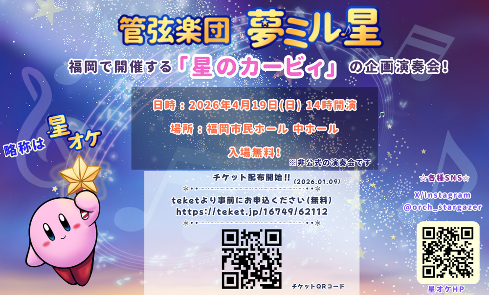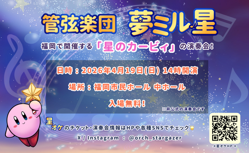 「星のカービィ」シリーズの楽曲が生のオーケストラの演奏で聴ける機会となっています♫ カービィやゲーム音楽が好きな方はぜひご来場ください!