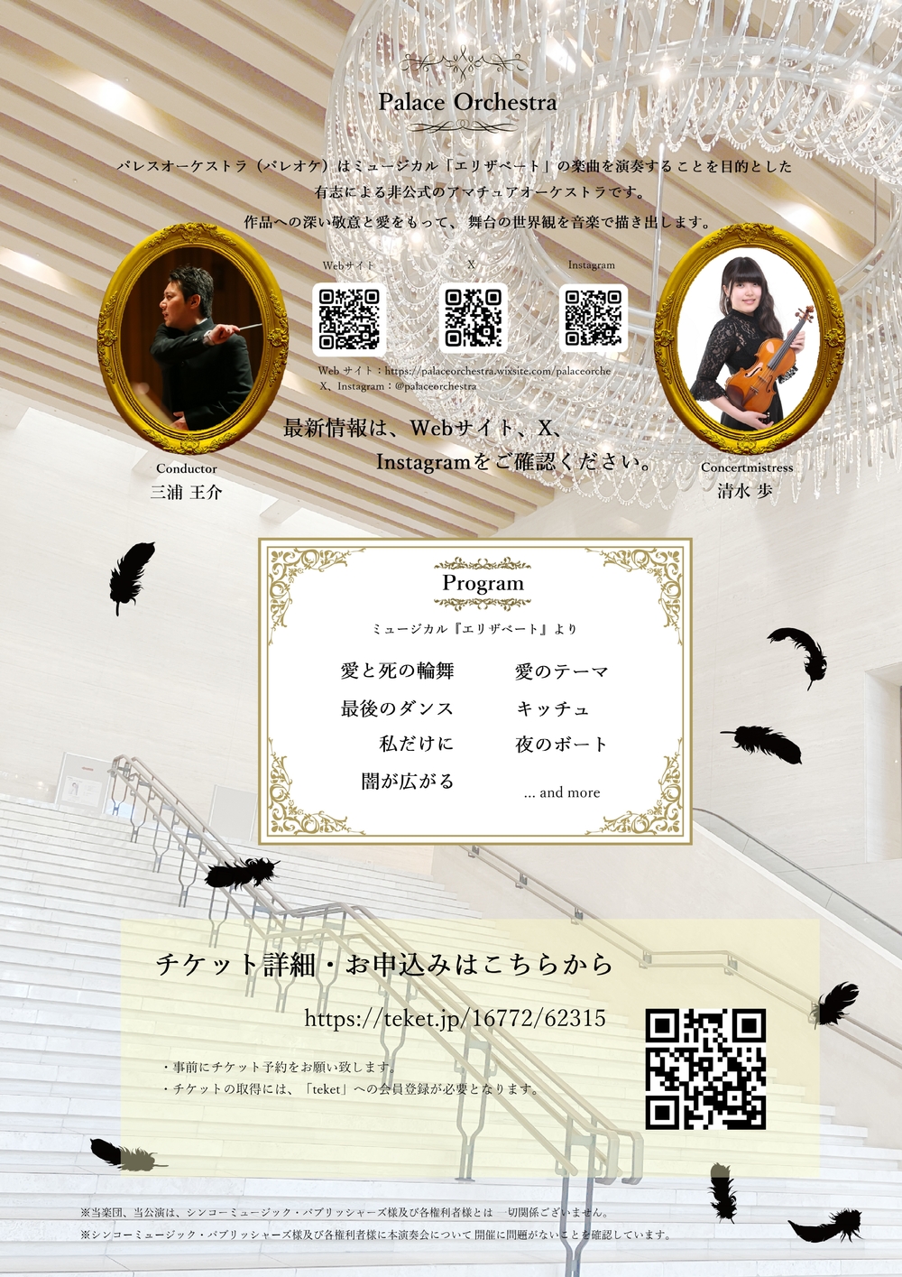 パレススオーケストラ(パレオケ)はミュージカル「エリザベート」の楽曲を演奏することを目的とした有志による非公式のアマチュアオーケストラです。