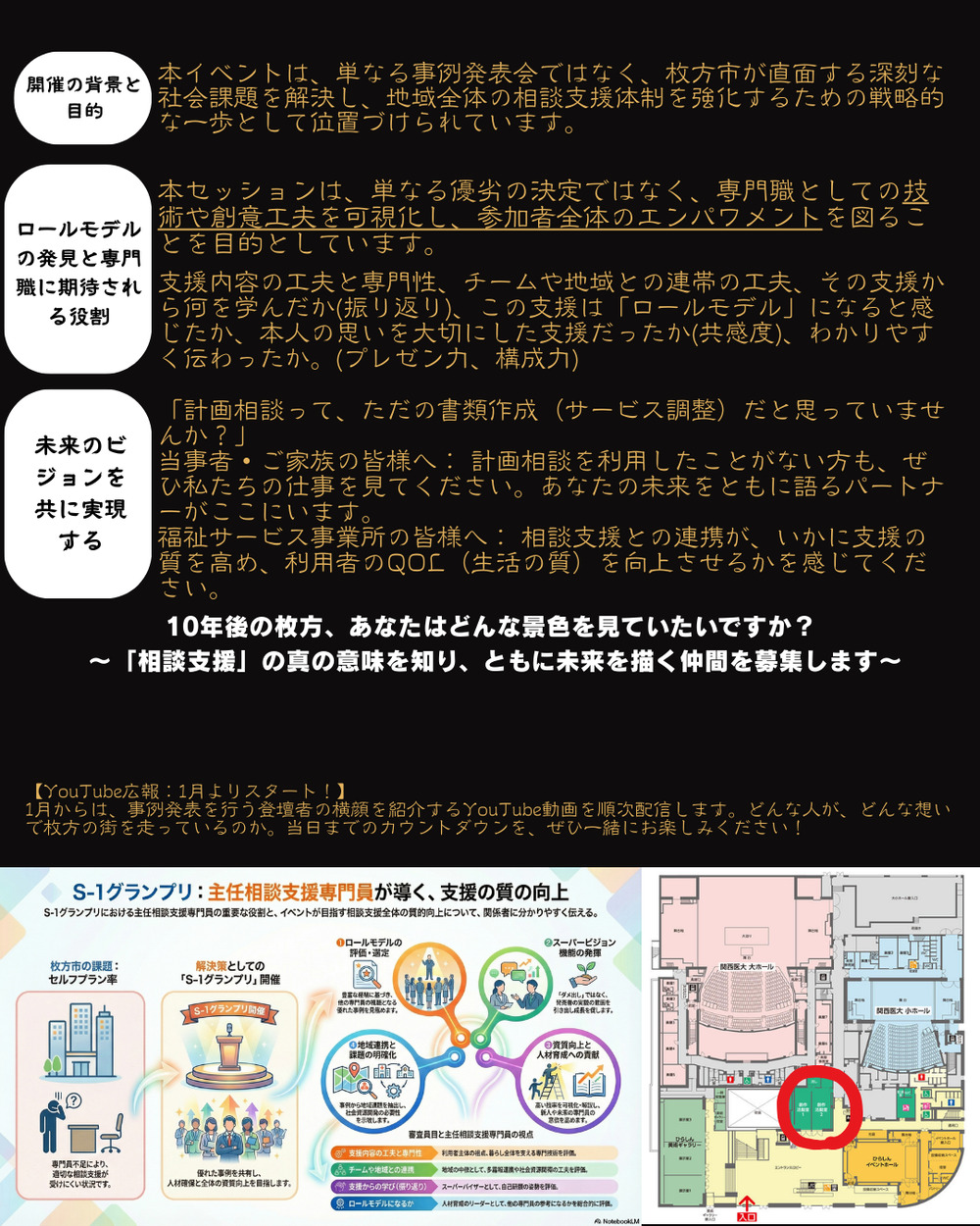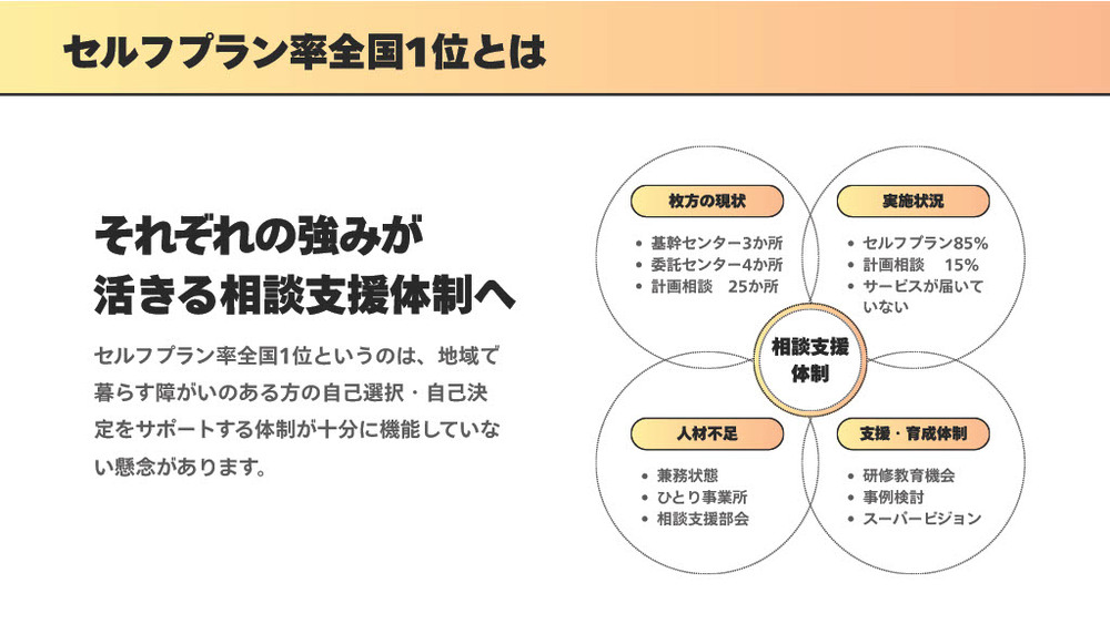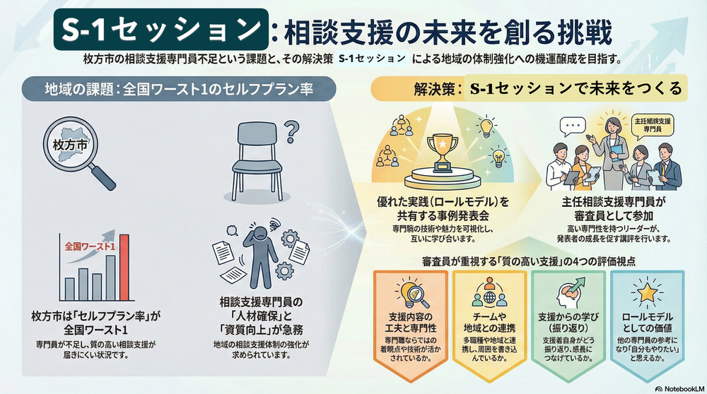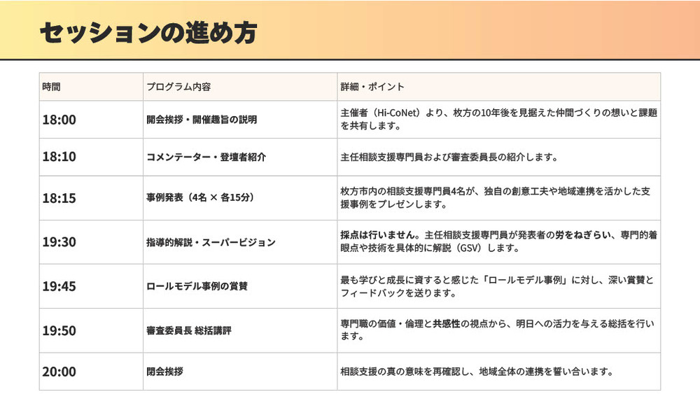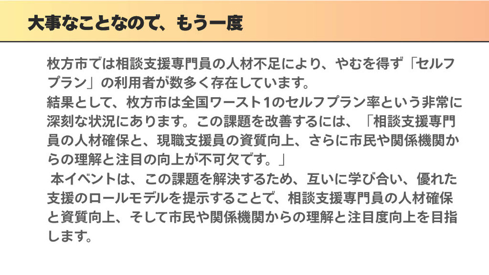 当日は枚方市内の相談支援専門員が、独自の創意工夫や地域連携を活かした支援事例をプレゼンします。