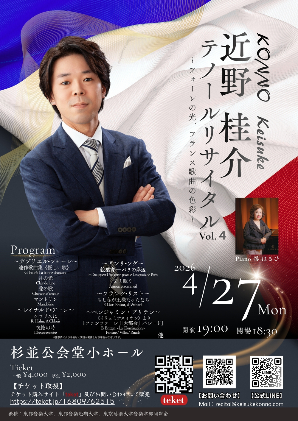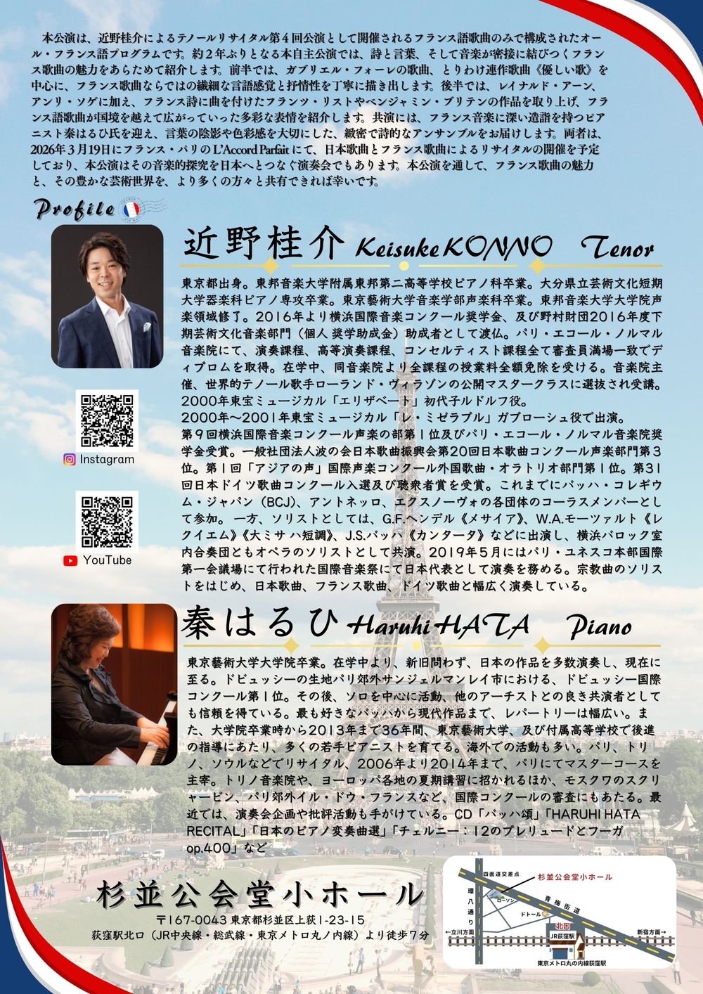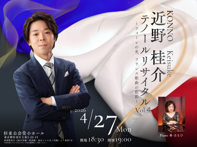 本公演は、近野桂介によるテノールリサイタル第4回公演として開催されるフランス語歌曲のみで構成されたオール・フランス語プログラムです。約2年ぶりとなる本自主公演では、詩と言葉、そして音楽が密接に結びつくフランス歌曲の魅力をあらためて紹介します。前半では、ガブリエル・フォーレの歌曲、とりわけ連作歌曲《優しい歌》を中心に、フランス歌曲ならではの繊細な言語感覚と抒情性を丁寧に描き出します。後半では、レイナルド・アーン、アンリ・ソゲに加え、フランス詩に曲を付けたフランツ・リストやベンジャミン・ブリテンの作品を取り上げ、フランス語歌曲が国境を越えて広がっていった多彩な表情を紹介します。共演には、フランス音楽に深い造詣を持つピアニスト秦はるひ氏を迎え、言葉の陰影や色彩感を大切にした、緻密で詩的なアンサンブルをお届けします。両者は、2026年3月19日にフランス・パリの L’Accord Parfait にて、日本歌曲とフランス歌曲によるリサイタルの開催を予定しており、本公演はその音楽的探究を日本へとつなぐ演奏会でもあります。本公演を通して、フランス歌曲の魅力と、その豊かな芸術世界を、より多くの方々と共有できれば幸いです。