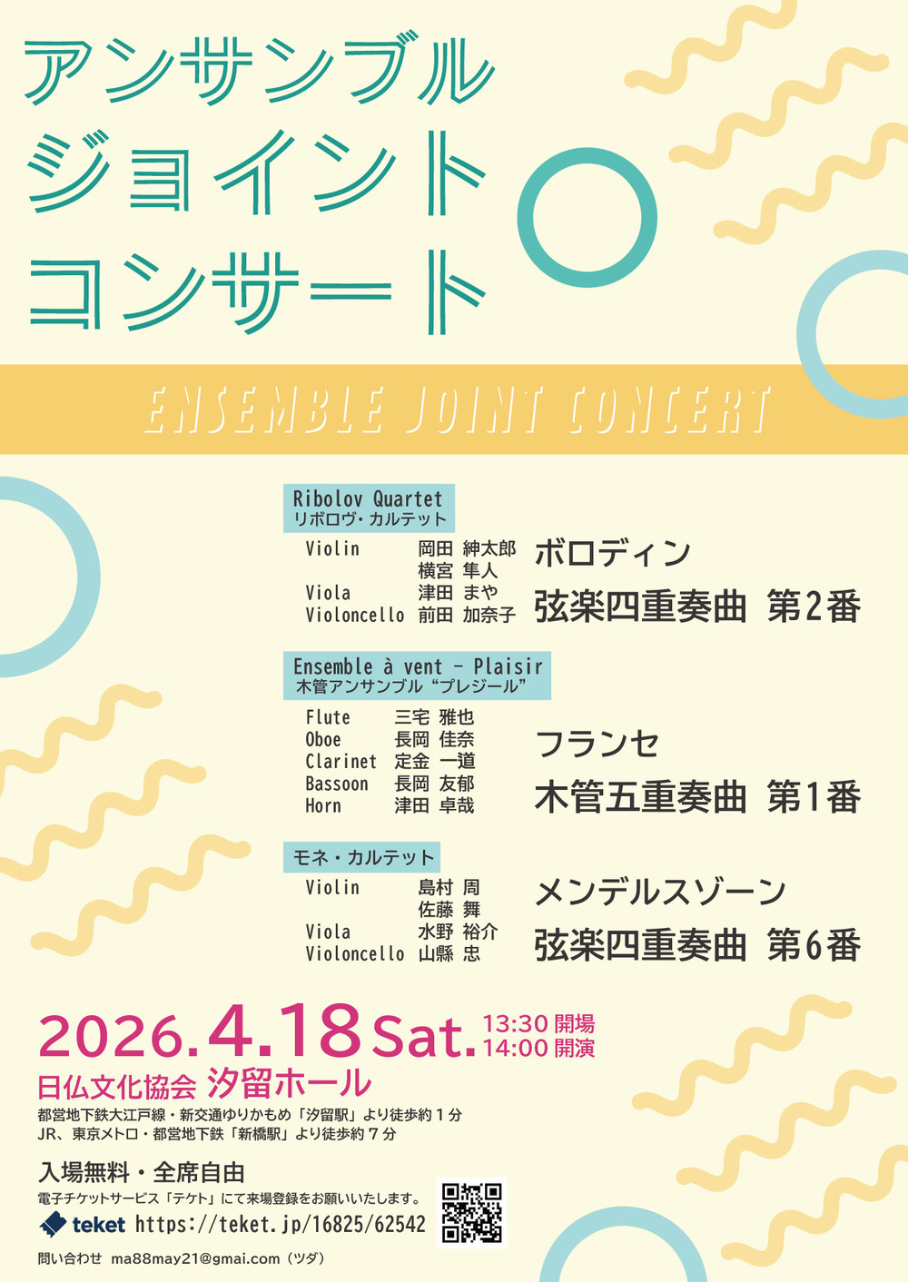 3つの室内楽団体によるジョイントコンサートです。ボロディン、フランセ、メンデルスゾーンの室内楽の名曲をお届けいたします。