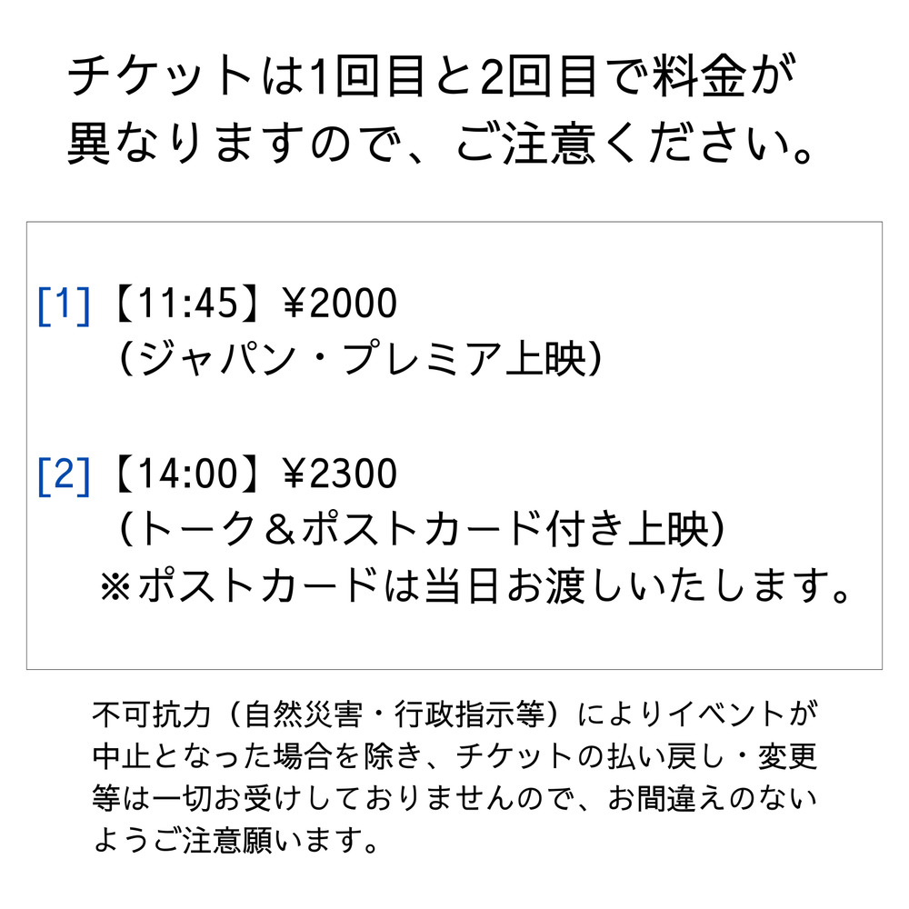 当日は2回上映を実施します。1回目は記念すべきジャパン・プレミア上映。そして2回目の上映はスペシャルトーク&特製ポストカード付き。