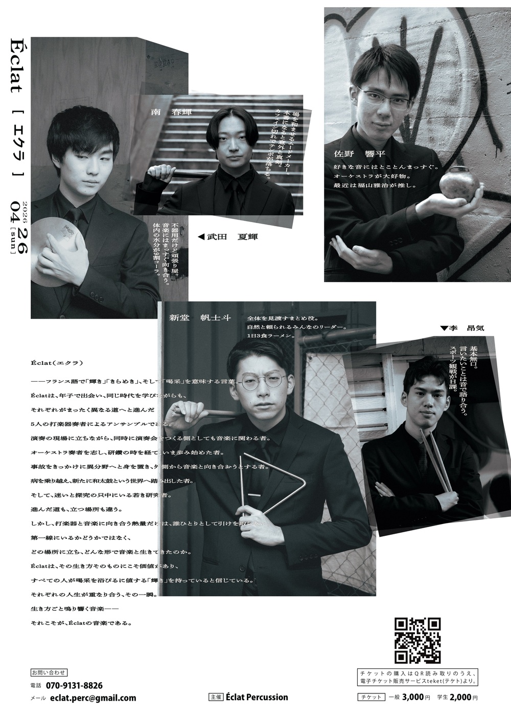 同じ学び舎を卒業後、オーケストラ奏者を志す者、事故を経て音楽と向き合い直す者、和太鼓の世界へ踏み出した者など、全く異なる道を歩んできた5人が再集結します。それぞれの「生き方」が音となってぶつかり合い、一つに溶け合う瞬間は、まさに「Éclat(喝采)」そのものです。