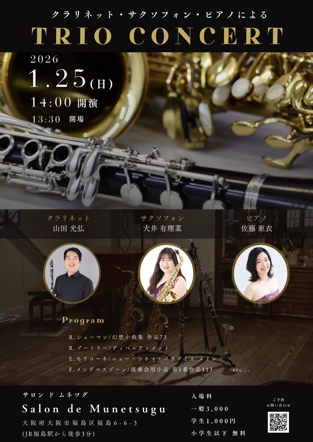 クラリネット・サクソフォン・ピアノという、少し珍しい編成による室内楽コンサートです。