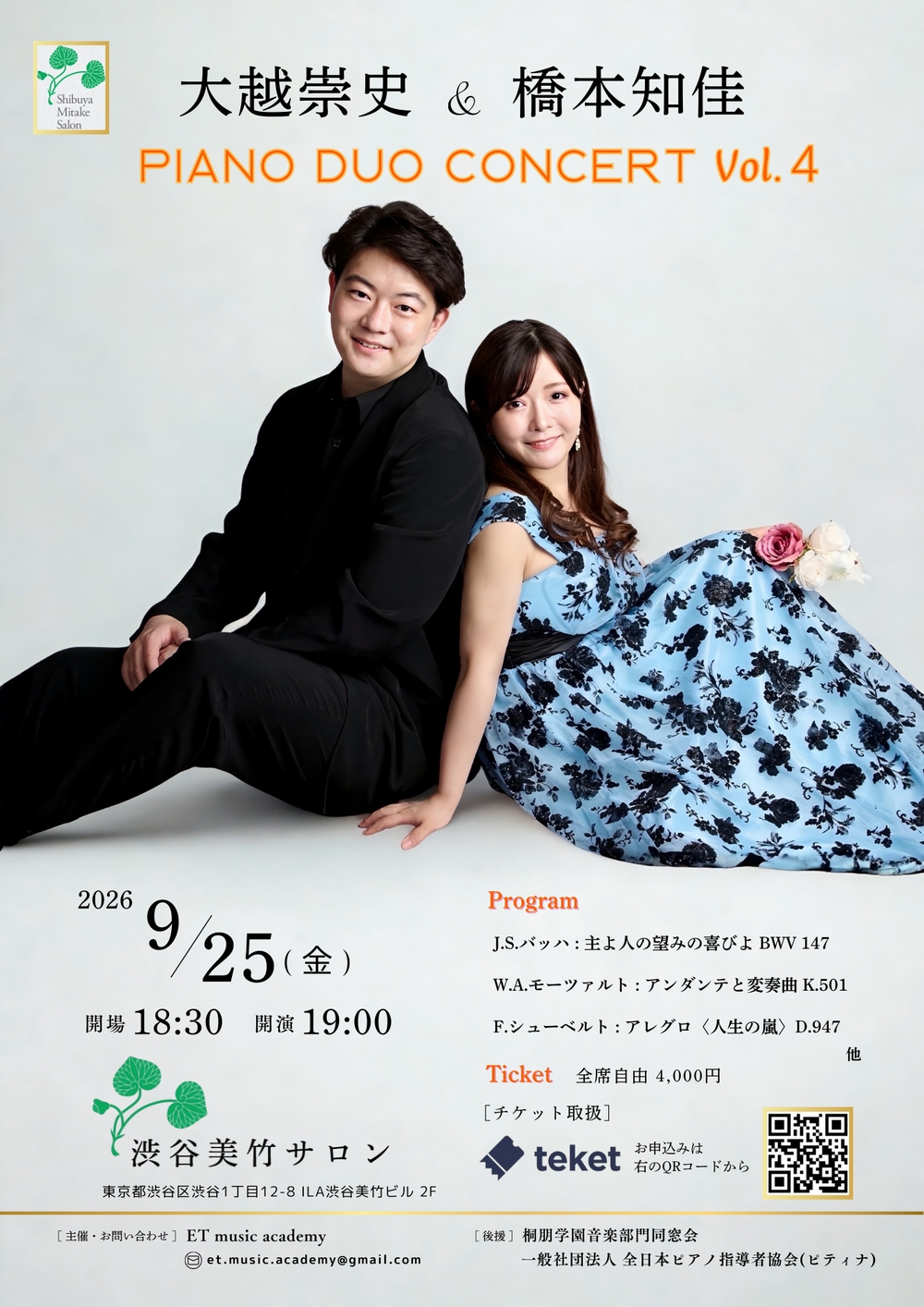 生誕270年のモーツァルト、歌曲王で知られるシューベルト等の連弾作品や大越、橋本によるピアノソロをお楽しみください。