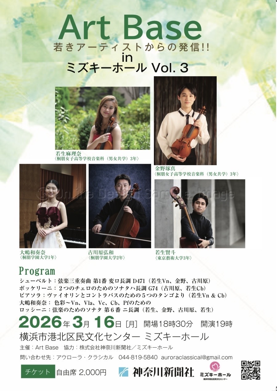 今回のArt Baseでは、イタリアバロックからアルゼンチンピアソラまで〜そして横浜出身の作曲家委嘱作品を学生演奏家パワー結集でお届けします!