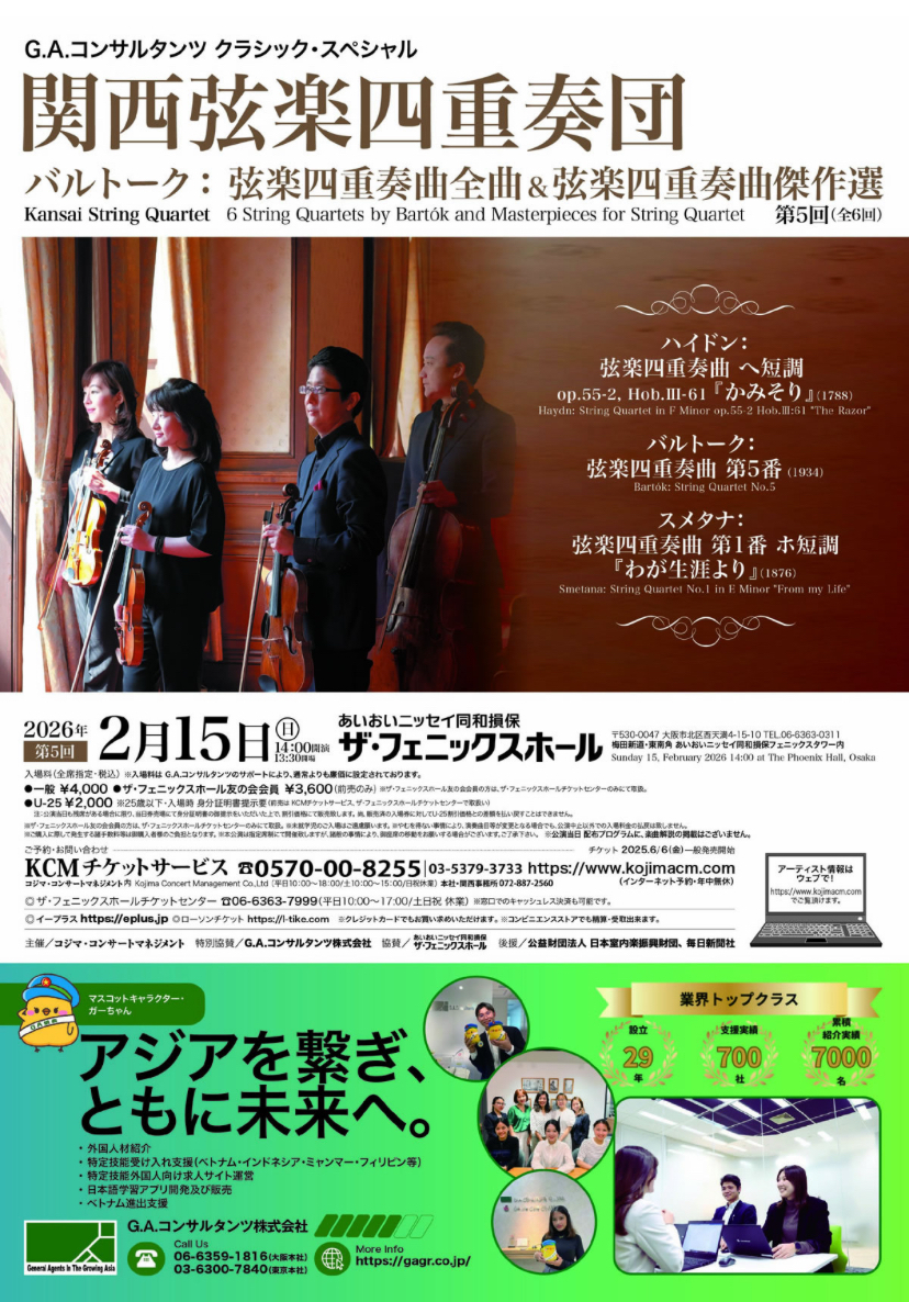 我々関西弦楽四重奏団にとって大きな挑戦になります、バルトークの人生を貫く6曲の弦楽四重奏曲全曲演奏会。弦楽四重奏の祖であるハイドンの作品と各時代の弦楽四重奏の名曲と共に、全6回のチクルスを全力で駆け抜けます!